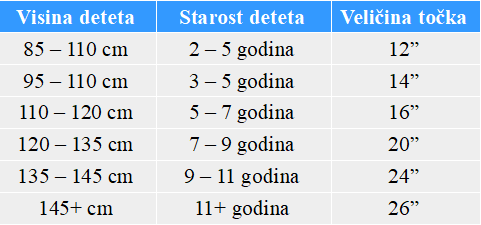 U tabeli možete pronaći detalje oko odabira veličine bicikla