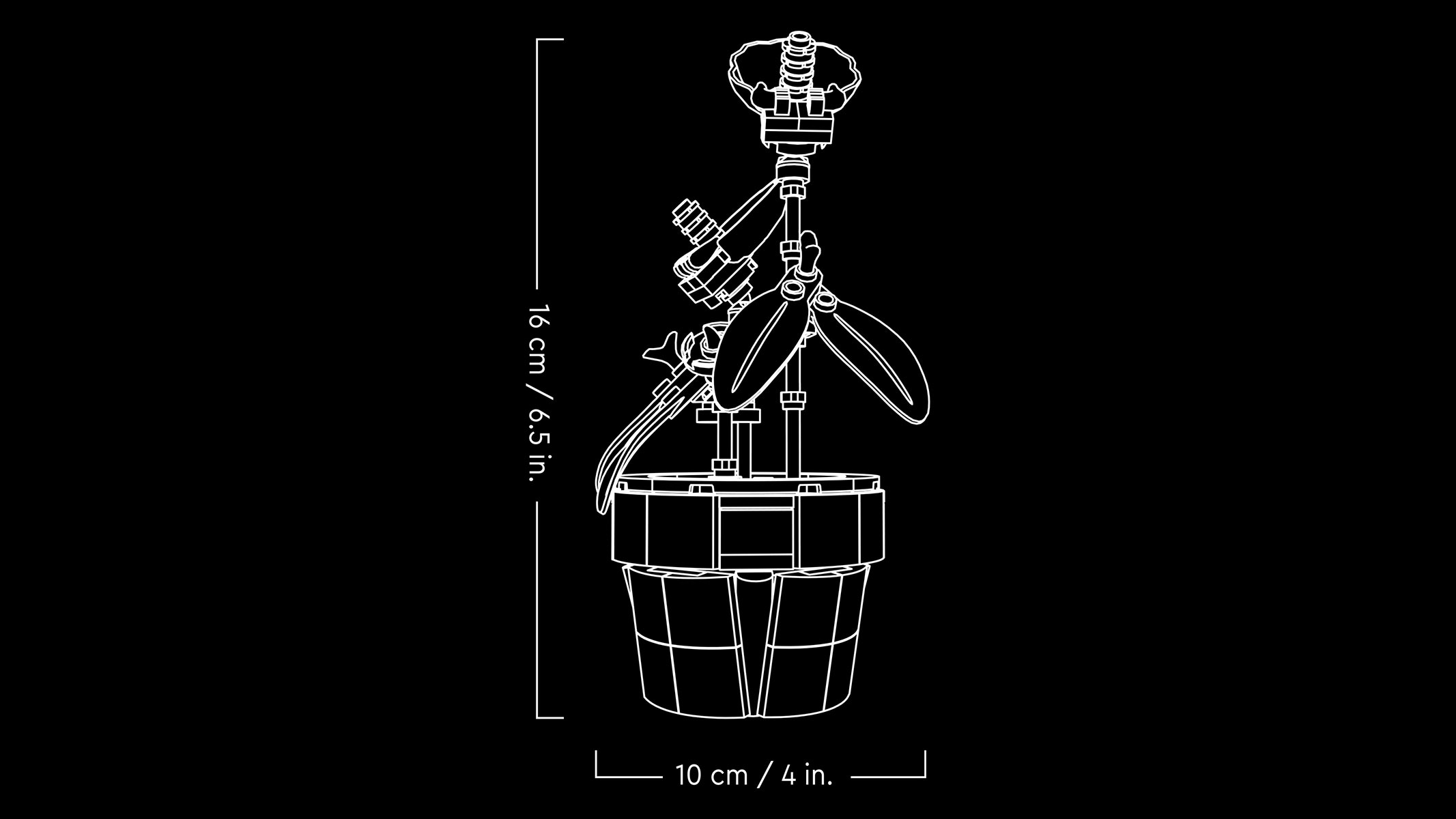 • Dimenzije – Najviša biljka u ovom kompletu za gradnju od 758 delova (uključujući posudu), visoka je više od 16 cm (6,5 in.), široka 10 cm (4 in.) i duboka 6 cm (2,5 in.)