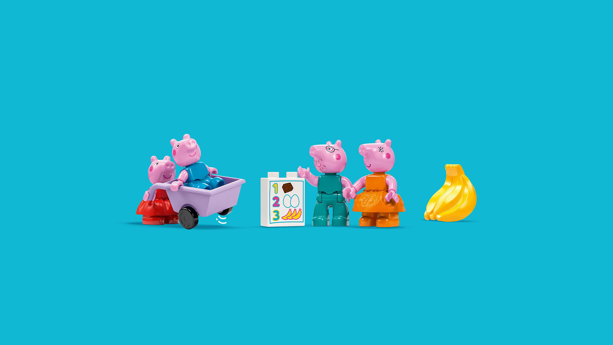 Ova „gradi i prepravljaj“ igračka za mališane ima pregršt dodataka za pokretanje kreativnog igranja uloga. Sa 4 figure – Pepe Praseta, Džordža, Mame Praseta i Tate Praseta – mališani mogu da se pretvaraju da su oboje i roditelji i deca. Predškolci će prepoznati predmete iz prodavnice u stvarnosti, kao što je kasa za samostalno skeniranje, kolica za kupovinu i rashladna vitrina.