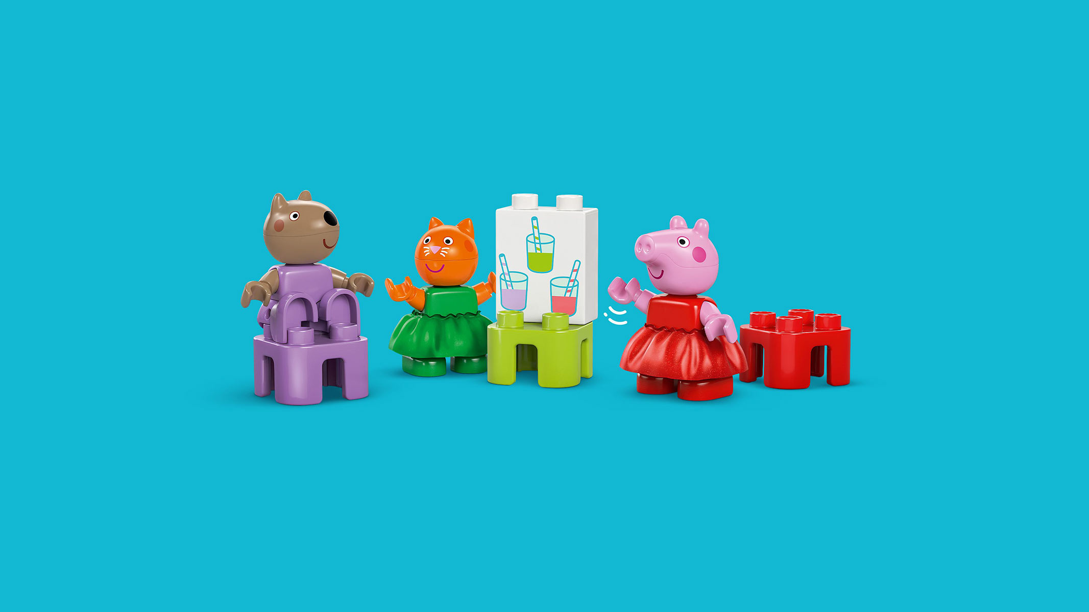• Komplet za gradnju prepun funkcija – ovaj komplet za igru za predškolce sadrži 3 LEGO® DUPLO® figure – Pepe Praseta, Denija Psa i Kendi Mace, kao i panoramski točak koji se okreće, igračku tobogan i mini-gradnju bar sa sokovima