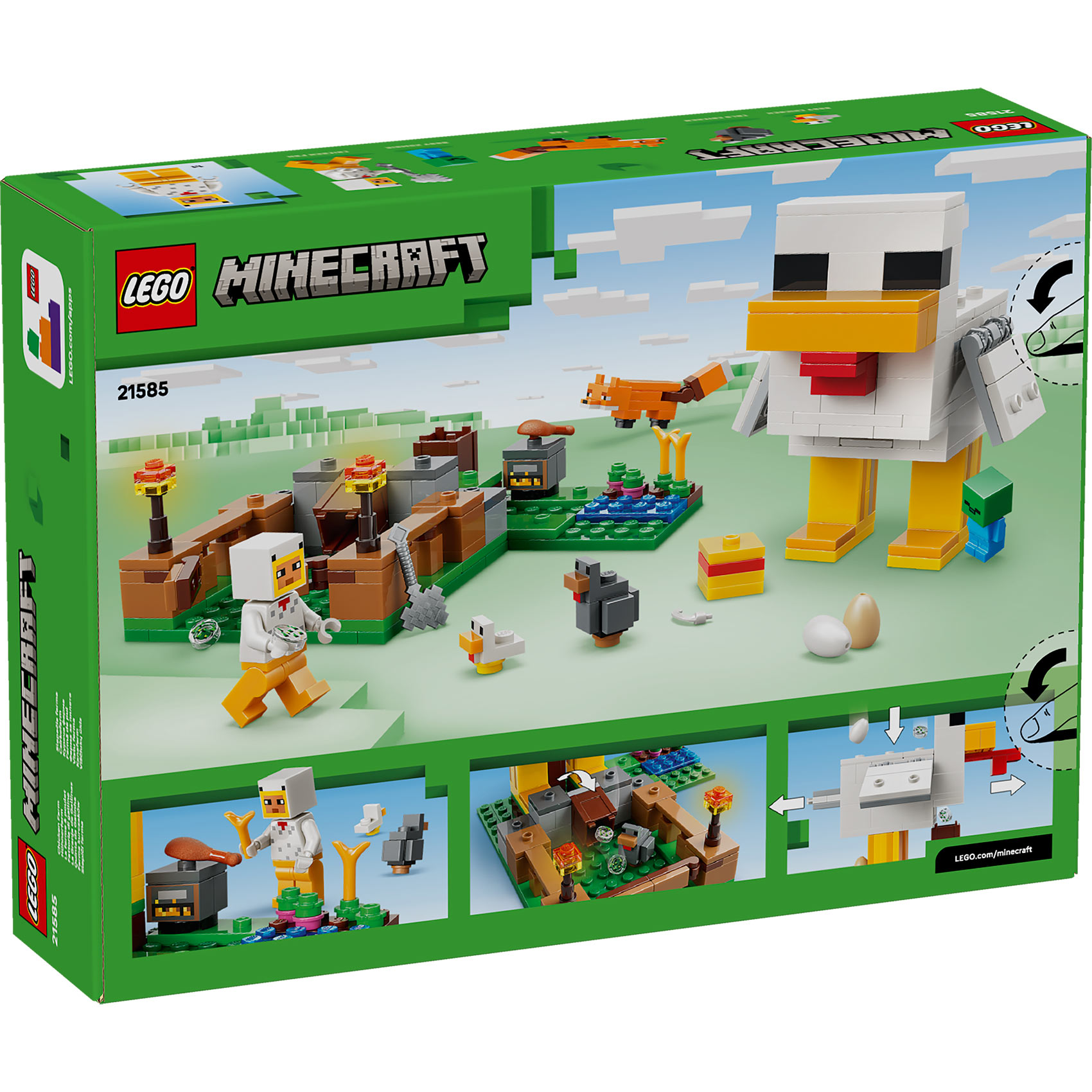 Ovaj Minecraft set (21585) namenjen je deci od 7 i više godina. Kokošinjac je dizajniran u obliku džinovske kokoške sa pokretnim krilima i ograđenim prostorom ispred ulaza. Velika kokoška "nosi" jaja na zadnjem delu i izbacuje seme iz usta pravo u posudu za hranjenje kada je povučeš napred.