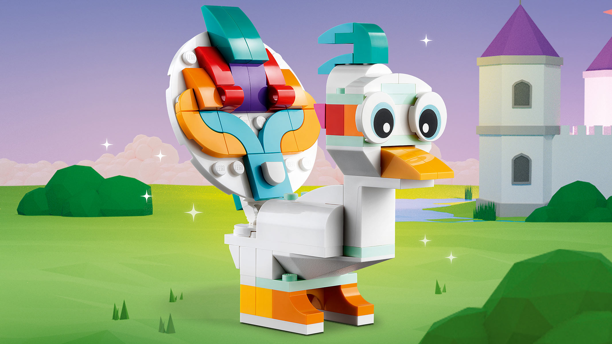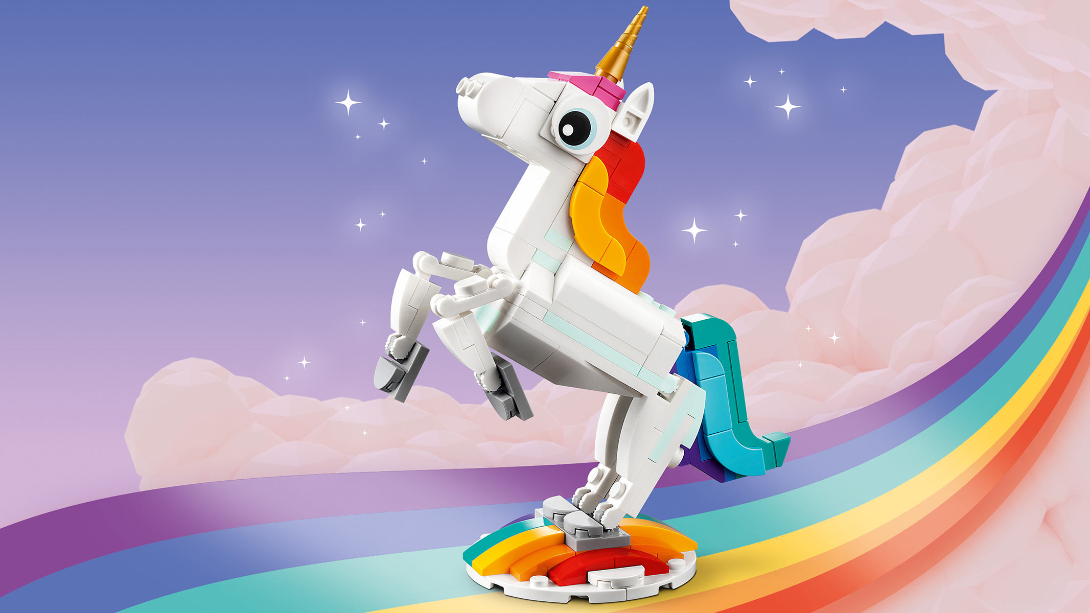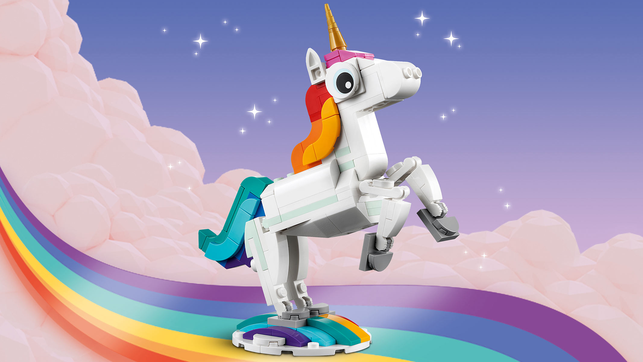 Maštovita deca uzrasta 7+ mogu da se transportuju u mitsku zemlju i uživaju u fascinantnoj akciji uz pomoć ovog 3 u 1 kompleta za gradnju – Magični jednorog (31140). Sadrži igračku jednoroga sa zlatnim rogom, šareni rep i podesive noge i kopita. Može da se predstavi u 2 različita položaja: dok stoji na sve 4 noge ili dok se propinje na 2 zadnje noge u čuvenoj pozi i može se izložiti na postolju sa dugom iz ovog kompleta.