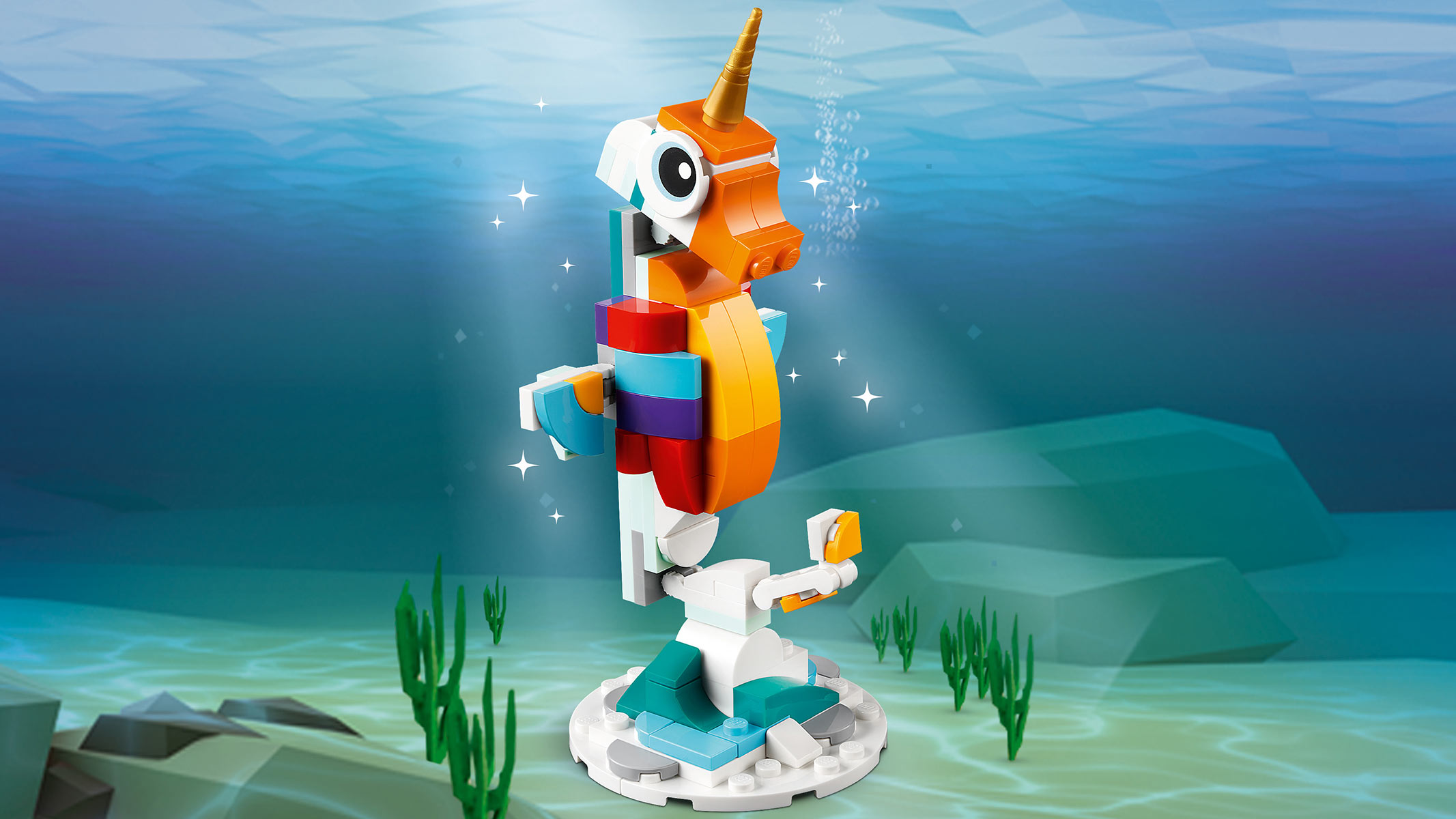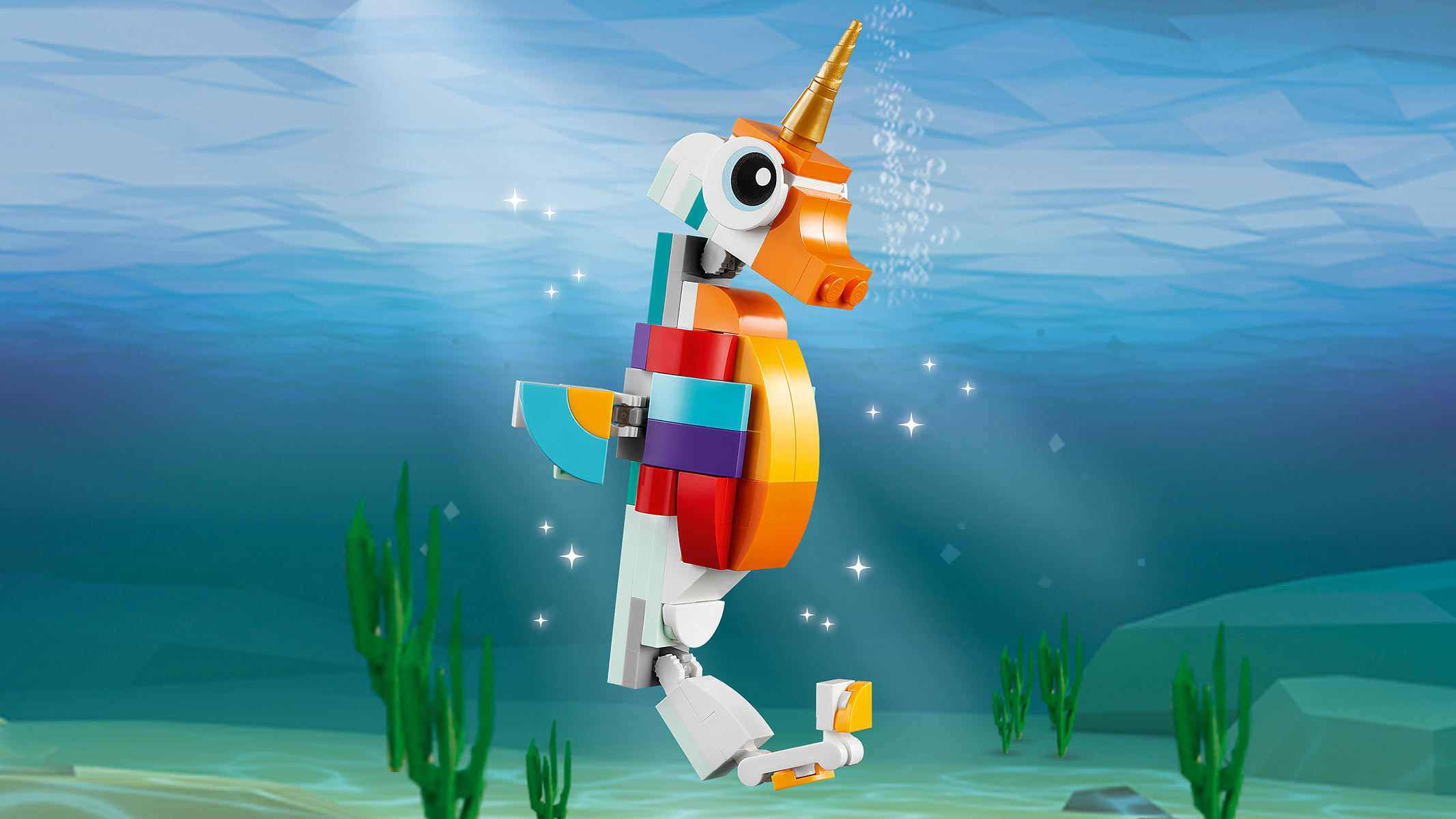 Mitska akcija nikada ne prestaje uz ovaj LEGO Creator 3 u 1 komplet i različita magična stvorenja koje mali graditelji mogu da sklope. Mogu da naprave podesivog magičnog jednoroga, da ga preprave u podesivog morskog konjića sa postoljem u vidu morskog dna, da ga pretvore u podesivog magičnog pauna sa šarenim repom ili čak da upotrebe kocke i naprave neko drugo očaravajuće stvorenje.