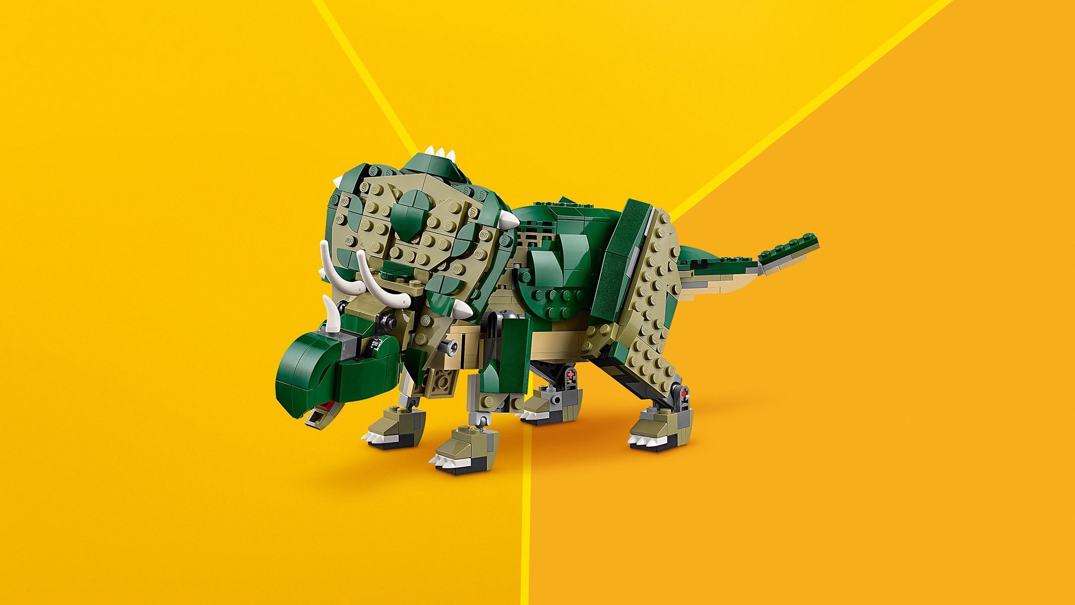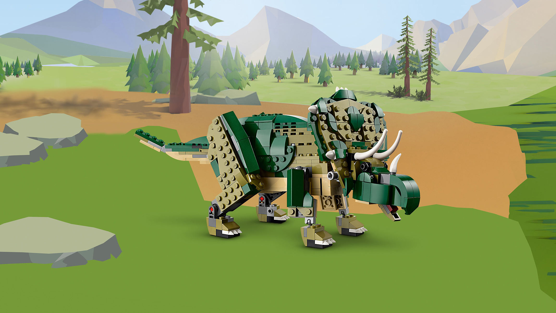 Ovaj LEGO® komplet za gradnju igračaka dinosaurusa pruža deci mnoštvo uzbudljivih mogućnosti za igru sa 3 različite igračke dinosaurusa koje treba izgraditi od istih kockica. Mogu da kreiraju podesivog Ti-reksa, da ga preprave u strašnog triceratopsa sa 3 roga, ili da ga pretvore u pterodaktila sa velikim pokretnim krilima.