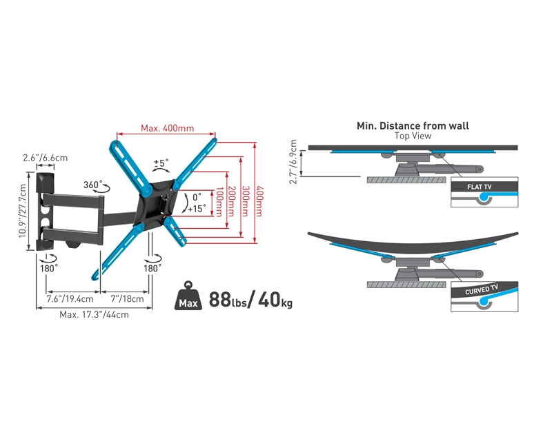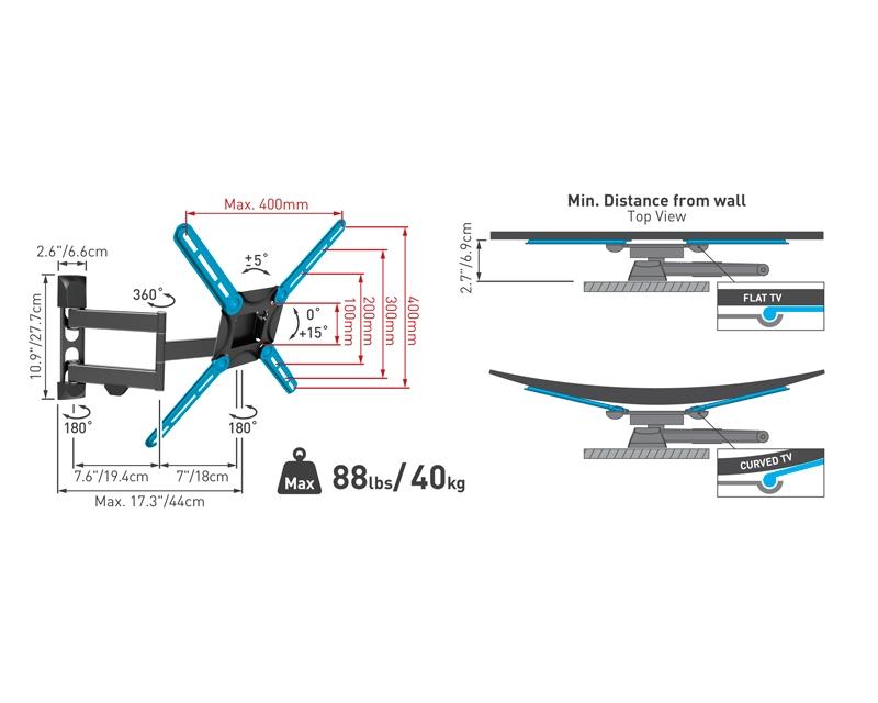 Karakteristike - Tip: Zidni nosač za televizor Montiranje: VESA 400mm x 100mm,VESA 400mm x 200mm,VESA 400mm x 300mm,VESA 400mm x 400mm Podržane dijagonale: Do 65 inča Nosivost: 40kg Rastojanje od zida: 69mm - 440mm Dodatne mogućnosti: Rotiranje 360 stepeni,Swivel,Tilt Uglovi pomeranja: Swivel ± 180 stepeni,Tilt 0 stepeni +15 stepeni,Vertikalna rotacija ± 5 stepeni Pakovanje: Set šrafova Stanje: Nekorišćeno Ostalo: Cable management,Mogućnost montiranja zakrivljenih televizora,Tilt lock funkcija Reklamacioni period - Reklamacioni period: 24 meseca