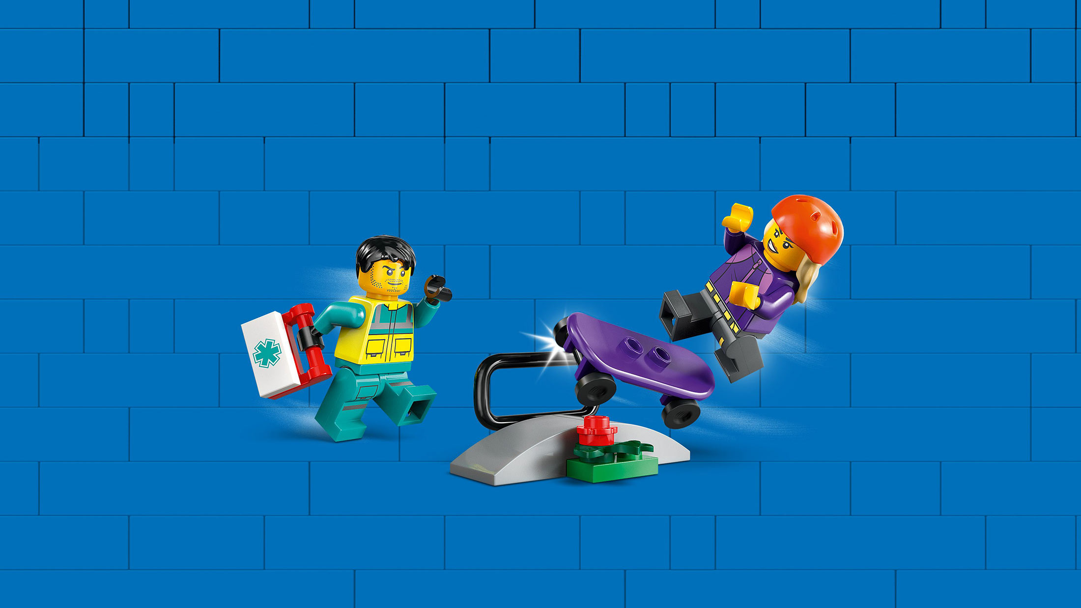 • Šta je u kutiji? – Sadrži sve što je deci potrebno za gradnju igračke vozila hitne pomoći, kao i skejtersku rampu koja se podešava i mini-figure skejtera i bolničara za igranje uloga