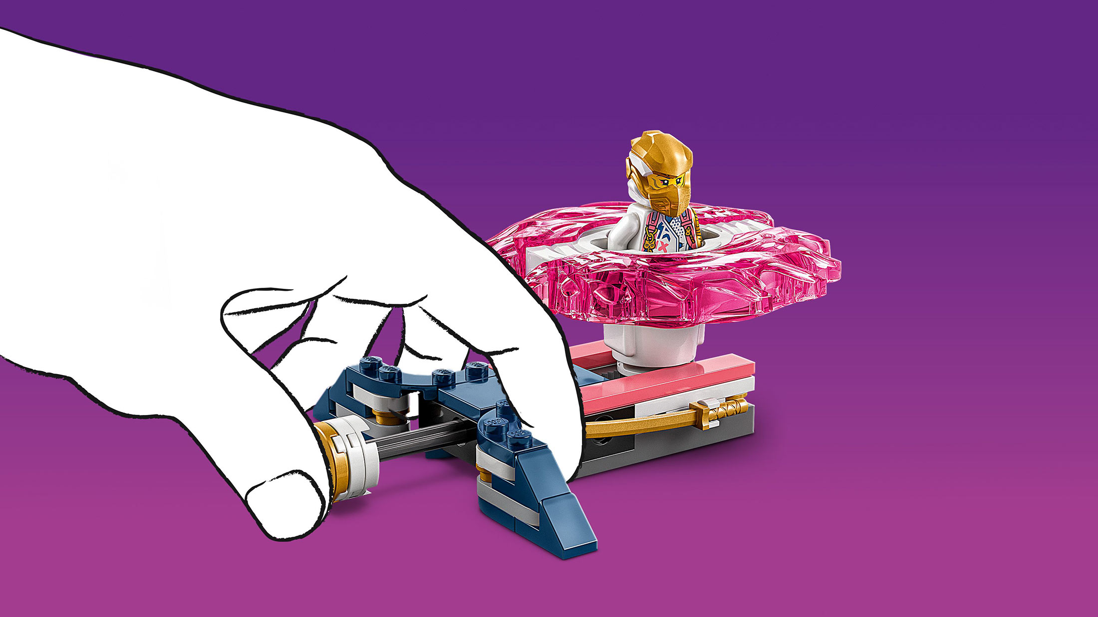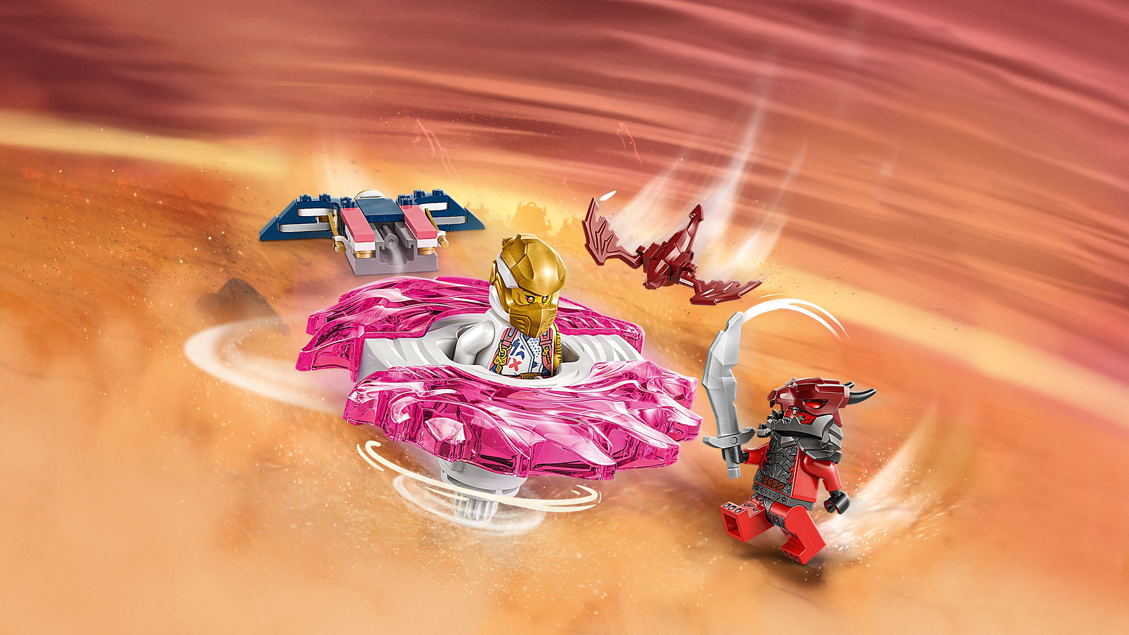 Lansirajte Soru u žestoku bitku protiv zlikovačkog Zmajevitog ratnika! Postavite nindžu Majstora tehnologije unutar zmajevitog spindžicu spinera i pritisnite dugme lansera. Gledajte kako se ona munjevito zavrti kako bi pobedila svog zlog protivnika. Kad spiner udari u svoju metu, 2 elementa snage možda će odleteti. Sora mora da odnese pobedu kako bi spasila novi NINJAGO® svet!