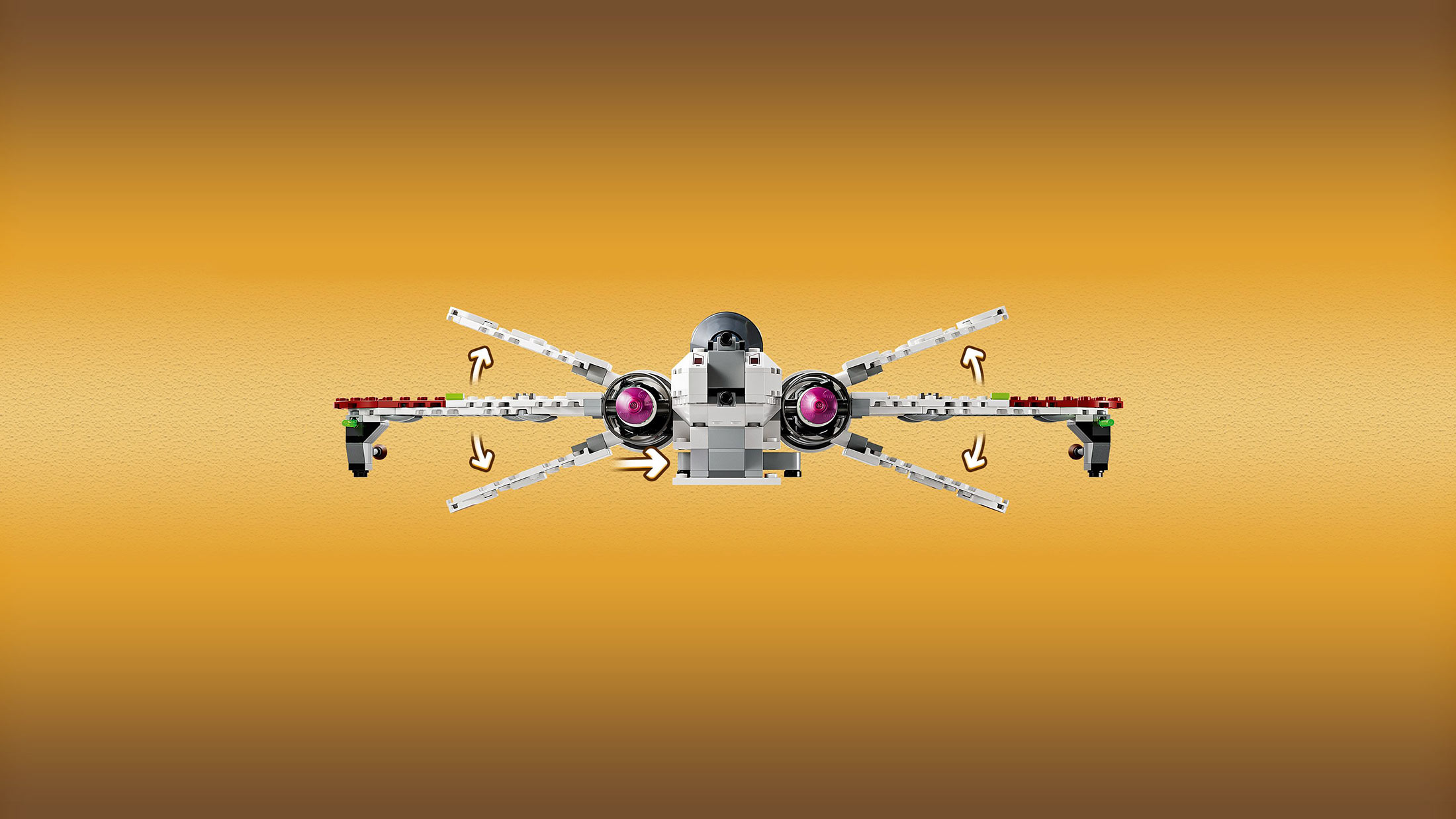 • Zvezdani lovac od LEGO® kockica – sadrži 3 kokpita koja se otvaraju, prostor za R4-P44, 6 krila, među kojima su i 4 podesiva krila sa polugom za režime napada i krstarenja, i 2 pucača sa oprugom