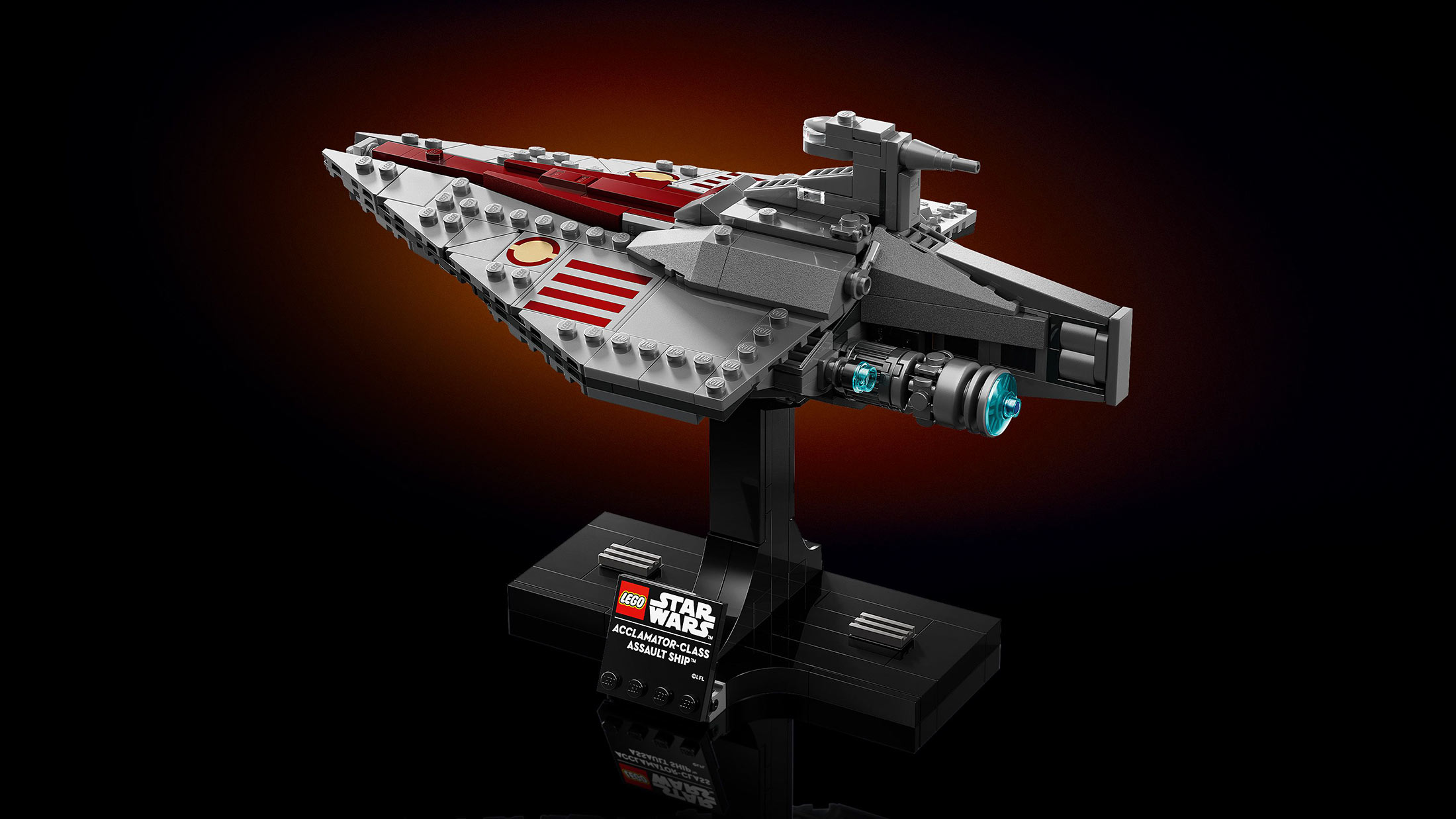 Izgradite prvi model Jurišnog broda klase Aklamator od LEGO® kockica, nalik onom u filmu Ratovi zvezda: Napad klonova™. Rekonstruišite autentične detalje svemirskog broda koji je prevozio legije klon trupera u Bitku na Geonozisu. Izložite kreaciju na postolju samu ili s drugim kolekcionarskim modelima napravljenim od kockica (koji se prodaju zasebno) iz LEGO Star Wars kolekcije svemirskih brodova