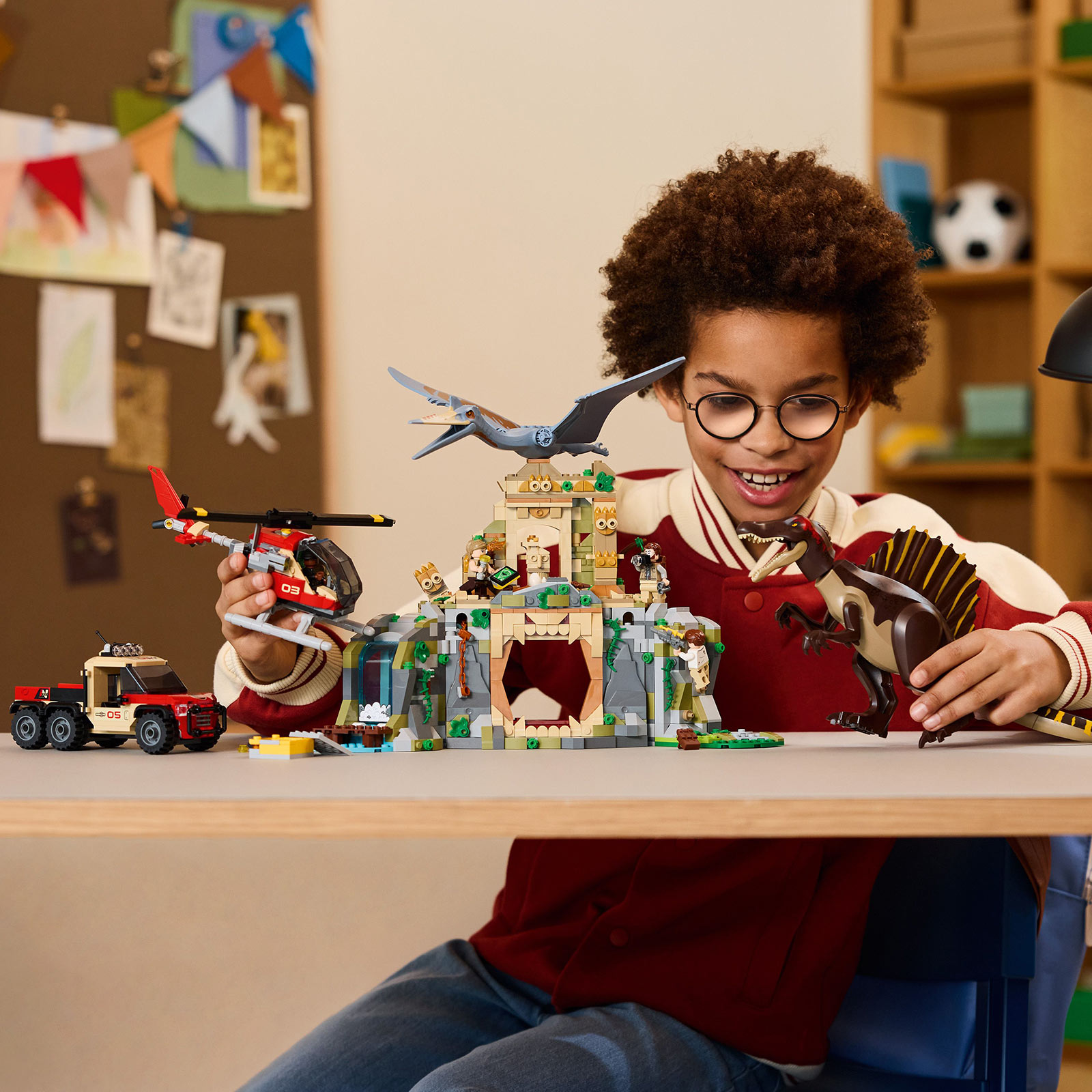 Avanture dinosaurusa čekaju decu i fanove uzrasta od 8 i više godina u interaktivnom kompletu igračaka koji se gradi LEGO® Jurassic World Vazdušna misija sa spinosaurusom i kvecalkoatlusom (76976). Dinosaurus kao poklon inspirisan filmom za dečake i devojčice sadrži 2 oblikovane figure dinosaurusa iz Sveta iz doba jure 4 i 4 junaka iz filma: Martina Krebsa, Zoru Benet, Dankana Kinkejda i doktora Henrija Lumisa. Spinosaurus ima pokretne noge, ruke, rep, glavu i vilicu. Kvecalkoatlus ima pokretna krila i vilicu. Osim toga, tu je drevni hram sa vodopadom, zamka sa sekirama koje padaju, stubovi koji padaju, gnezdo i jaja. Tu je i igračka helikopter, igračka kamion, kofer sa 3 šprica i još ponešto.