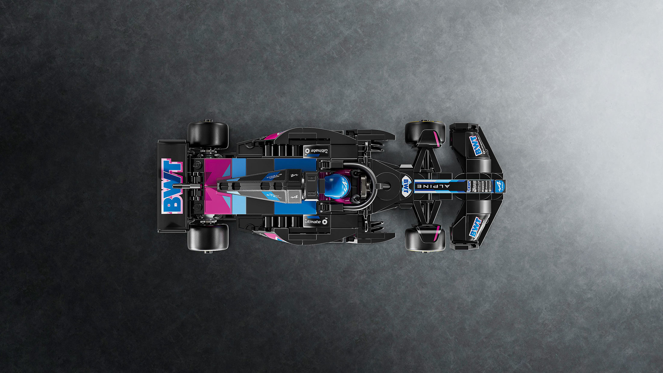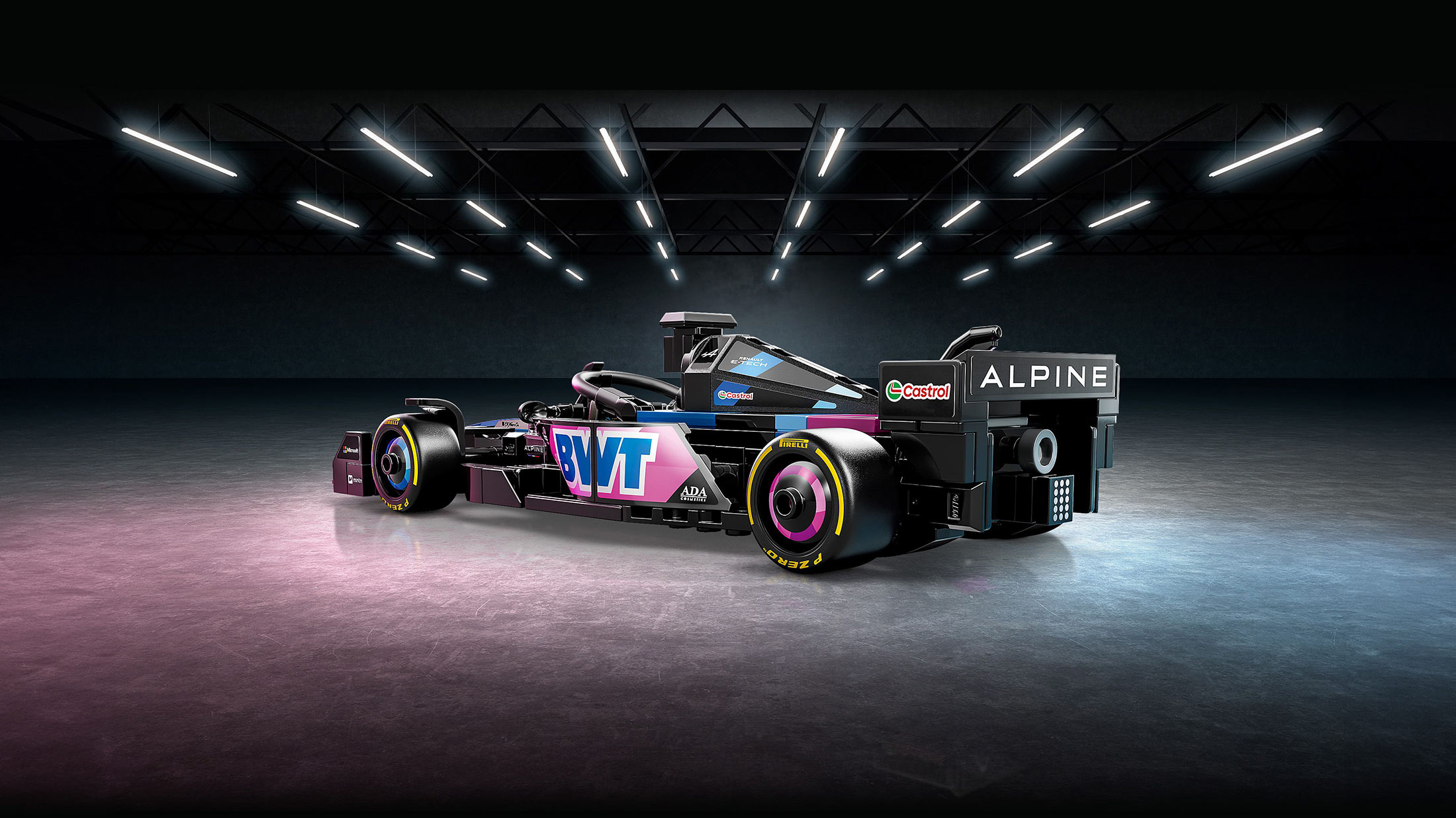 • Autentični detalji BVT Alpine F1® Team – F1 trkački automobil sa detaljima dizajna prave verzije za 2024. godinu, među kojima su zadnje krilo, halo šipka, sponzorske nalepnice i šire zadnje gume sa utisnutim natpisom „Pirelli"