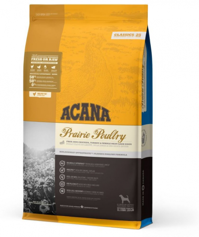 - Hrana za pse namenjena odraslim psima svih rasa. Receptura Acana Classic Prairie Poultry se temelji na principu WHOLEPREY, koji se orjentiše prema prirodnim nutritivnim potrebama odraslih pasa. Sastav je prilagođen prirodnom plenu predaka koji su živeli u divljini i sadrži ćuretinu, jaja i piletinu od čega je trećina sveže meso. Umesto pšenice koja sadrži visok glihemijski indeks, koristi se zob sa niskim glihemijskim indeksom kao izvor ugljenih hidrata kako bi se sačuvao stabilan nivo šećera u krvi. 50% voća, povrća i biljnih ekstrakta snavdevaju organizam sa svim važnim mineralima, vitaminima i hranljivim materijama koji su neophodni za potpuni prehrambeni profil. Kvalitet sastojaka je najvažnije što u ovoj hrani potvrđuju sastojci koji se koriste za ljudsku upotrebu. Piletina, ćuretina i sveža cela jaja potiču sa prerijskih farmi u regiji i dostavljaju se sveži i sveže prerađeni. Voće sa polja i livada nude širok spektar hranljivih materija.