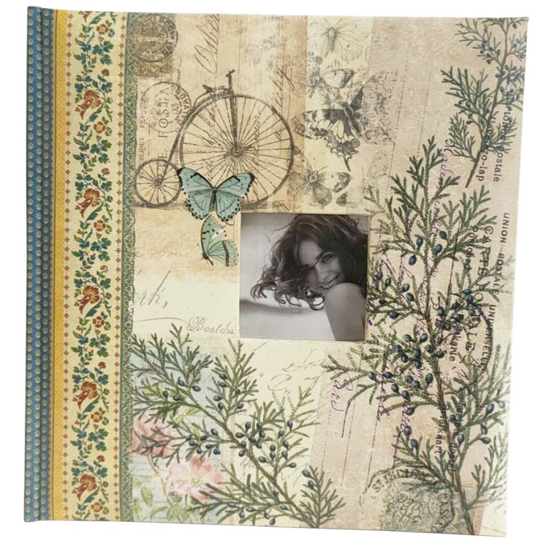 - Foto album za 200 slip in džepova za fotografije 10x15, sa memo prostorom pored za upisivanje datuma i komentara. Na koricama je ram za fotografiju, crteži biljaka iz herbarijuma, velocipeda i leptira. Album je upakovan u providnu zaštitnu foliju. Dimenzija albuma je 21x20cm.