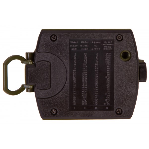 - Urez na telu kompasa omogućuje ciljanje udaljenih predmeta i određivanje pravca (azimut). Preko posebnog sočiva možete vidjeti tačan broj na ruži kompasa. U urezu za posmatranje nalazi se milimetarska skala za merenje udaljenosti između objekata. Za rad s mapama koriste se dve skale: jedna je skala u centimetrima, dok je druga u inčima. Na poleđini kompasa nalazi se tablica s formulama.