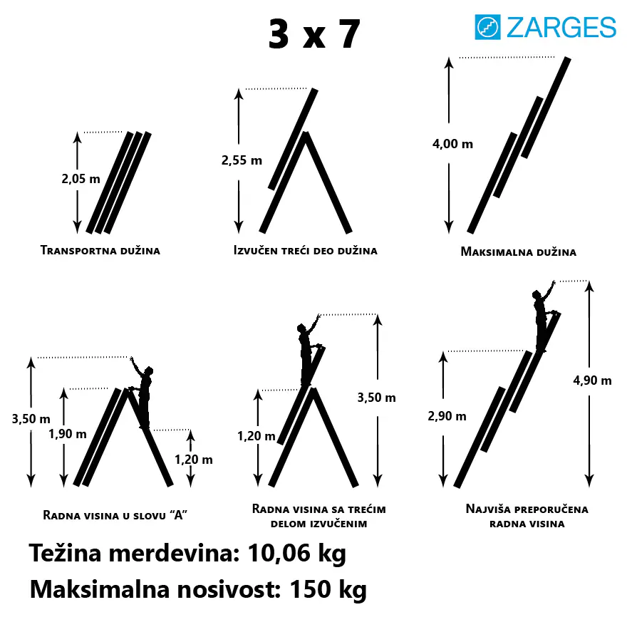 Zarges aluminijumske univerzalne merdevine sa 3x7 gazišta i maksimalnom nosivošću od 150 kg.