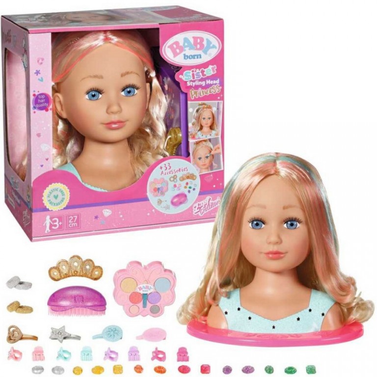 - BABY Born rođena Sister Stiling Head Princess u kompletu sadrzi : paletu šminke, četku za kosu, 4 kopče za kosu, 8 iglica, 4 ukosnice, dijademom sa češljem i 14 ubadača sa draguljima.