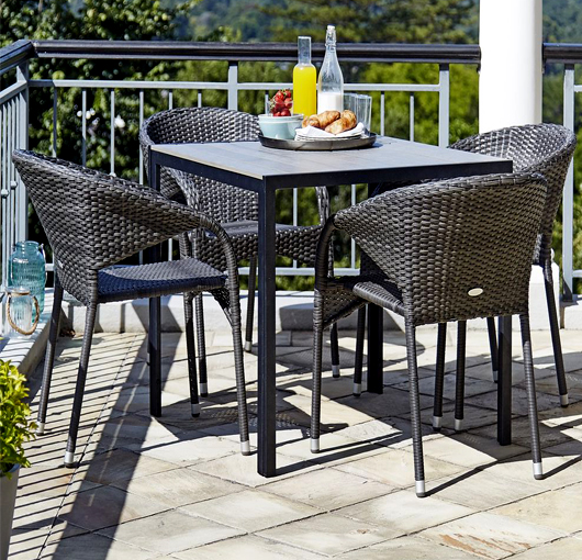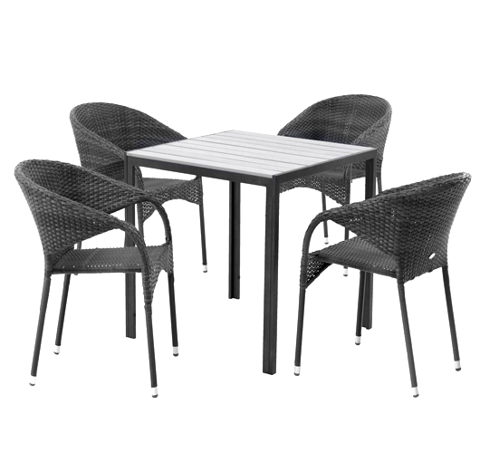 Baštenska garnitura Arnold sajstoji se od masivnog, četvrtastog stola sa čeličnom konstrukcijom i pločom od veštačkog drveta. Veštačko drvo je izuzetno otporna vrsta plastike koja se naziva polistiren i ima UV-zaštitu. Zahvaljujući njegovoj čvrstoći i izgledu poput prirodne strukture drveta, veštačko drvo je kombinacija lepote pravog drveta kao i funkcionalnosti i dugotrajnosti. Lako se čisti sapunom i vodom. Pored stola dobijate i 4 baštenske stolice koje su složive jedna u drugu pa ih lako možete odložiti. Stolice imaju čeličnu konstrukciju i opletene su petanom. Petan veštački pleteni materijal. Za razliku od prirodnog pletenog materijala, veštački pleteni materijal je izrađen od sintetičkih materijala. Nameštaj od veštačkog pletenog materijala može ostati na otvorenom tokom cele godine, ne zahteva održavanje i lako se čisti sapunicom i vodom.