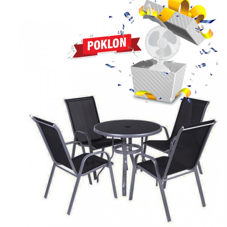 - Baštenski sto je izradjen od plastificiranog metala sa crnim kaljenim stolom debljine 5 cm, i rupom na sredini za suncobran
