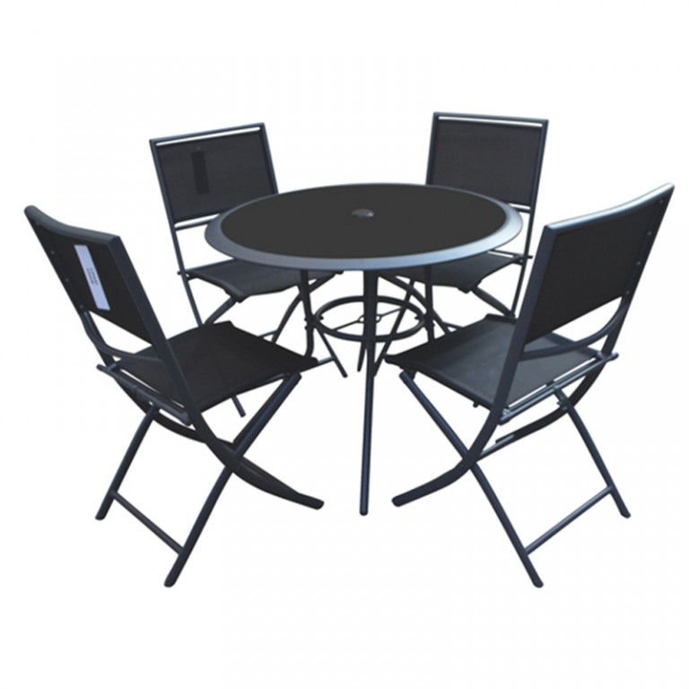 Set sto sa 4 sklopive stolice i stolom. Sto i stolice su metalne konstrukcije sa platnenim sedalnim delom i naslonom, dok se na stolu nalazi rupa za suncobran. Takođe, na stolu se nalazi kaljeno staklo debljine 5mm u crnoj boji. Ceo set je premazan specijalnim premazom za spoljašnju upotrebu.