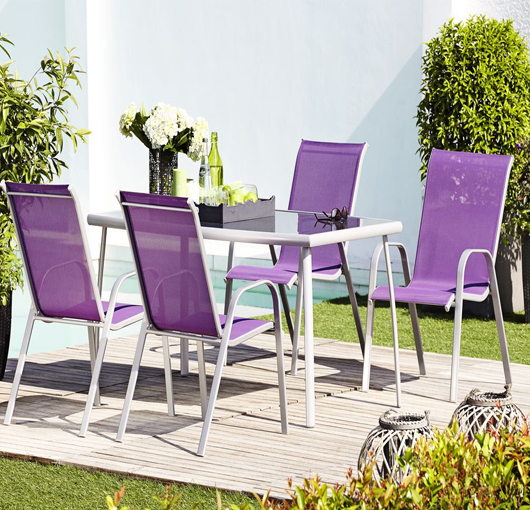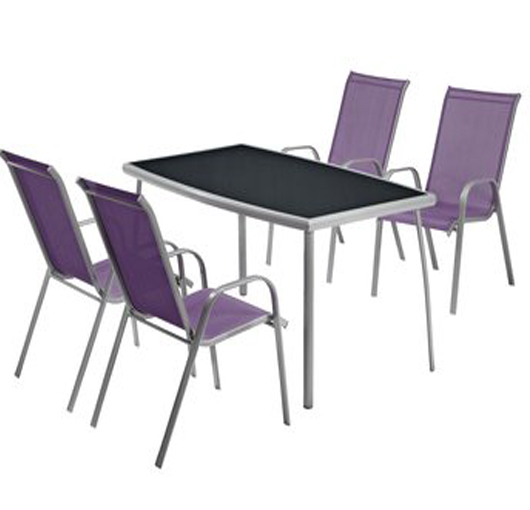 Baštenska garnitura Lilac, prava kombinacija dobrog, savremenog dizajna, trajnosti i funkcionalnosti. Aluminijumski sto sa pločom od kaljenog stakla i četiri stabilne stolice prelepe nijanse ljubičaste koje se mogu složiti jedna u drugu. Aluminijum je lagan i elegantan materijal koji ne rđa. Nije zahtevan održavanje i lako se čisti vlažnom krpom. Neprobojno staklo će u slučaju loma pući kao staklo na vetrobranu. Na taj način se izbegavaju oštre ivice na razbijenom staklu.. Stolice sa čeličnom konstrukcijom što garantuje čvrstinu. Tokom zime bi trebalo da se čuva na suvom mestu da bi se sprečilo rđanje. Tekstilen je pleteni materijal koji ne zahteva održavanje, mekši od drugih vrsta veštačkih pletenih materijala.