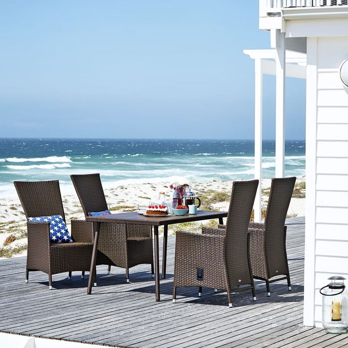 Garnitura za baštu sa četiri udobne stolice i luksuznim stolom od čelika i veštačkog, dugotrajnog drveta. Ne zahteva održavanje. Baštenska garnitura otporna je na vremenske uslove i ne zahteva održavanje.