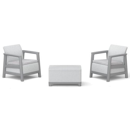 Set sadrži dve udobne fotelje i funkcionalan box sto sa praktičnim prostorom za odlaganje – idealno rešenje za uredan i organizovan balkon ili baštu, sa svime što vam je uvek pri ruci.