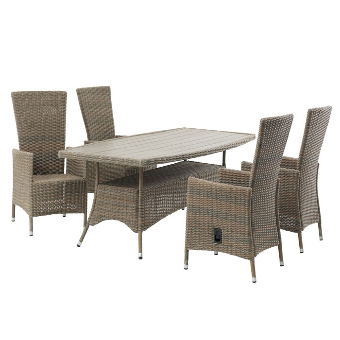 Baštenska garnitura sa velikim stolom i modernim, podesivim stolicama od čelika i petana sa kliznim naslonom.