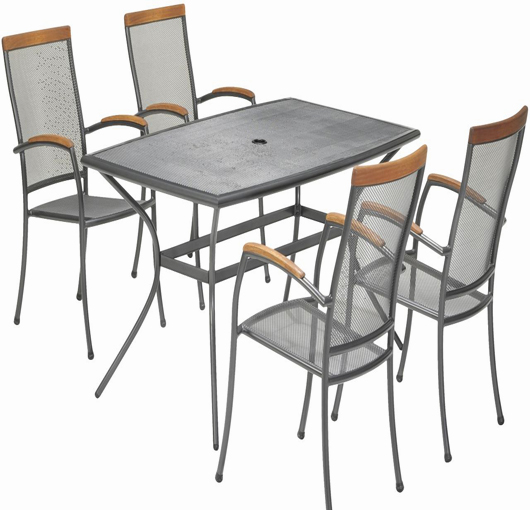Baštenska garnitura Vicky, luksuzan baštenski sto aluminijumske konstrukcije sa površinom stola od čelika. Aluminijum je lagan i elegantan materijal koji ne rđa. Ne zahteva održavanje i lako se čisti vlažnom krpom. Čelik je teži, čvršći i jači od aluminijuma i ne zahteva održavanje. Tokom zime bi trebalo da se čuva na suvom mestu da bi se sprečilo rđanje. Pored stola dobijate i 4 složive i udobne baštenske stolice koje su izrađene od kombinacije aluminijuma i čelične mreže. Nasloni za ruke kao i ivice naslona izrađeni su od FSC-tvrdog drveta.