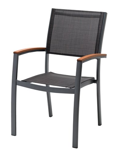 Lagana baštenska stolica od aluminijuma i dugotrajnog textilena. Nasloni za ruke od tvrdog drveta.