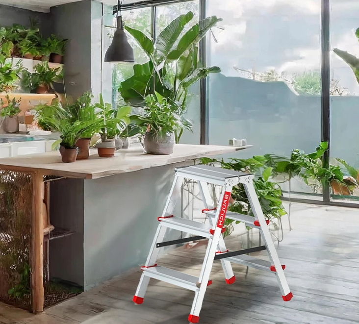 - Merdevine su opremljene užlebljenom, neklizajućom platformom koja omogućava udoban i bezbedan rad na merdevinama.