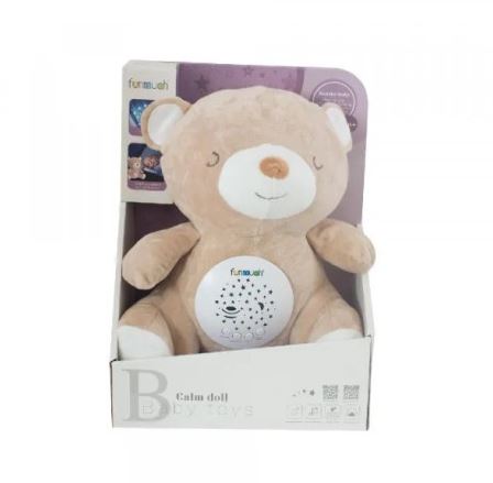 - Pomoću dugmića podesite koja melodija će svirati, kojom jačinom i koju boju će projektovati stomačić ovog preslatkog medveda.
