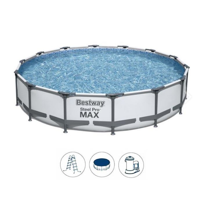 - Nadzemni porodični bazen sa konstrukcijom od metalnih šipki. Lako se montira postavljanjem na ravnu površinu.