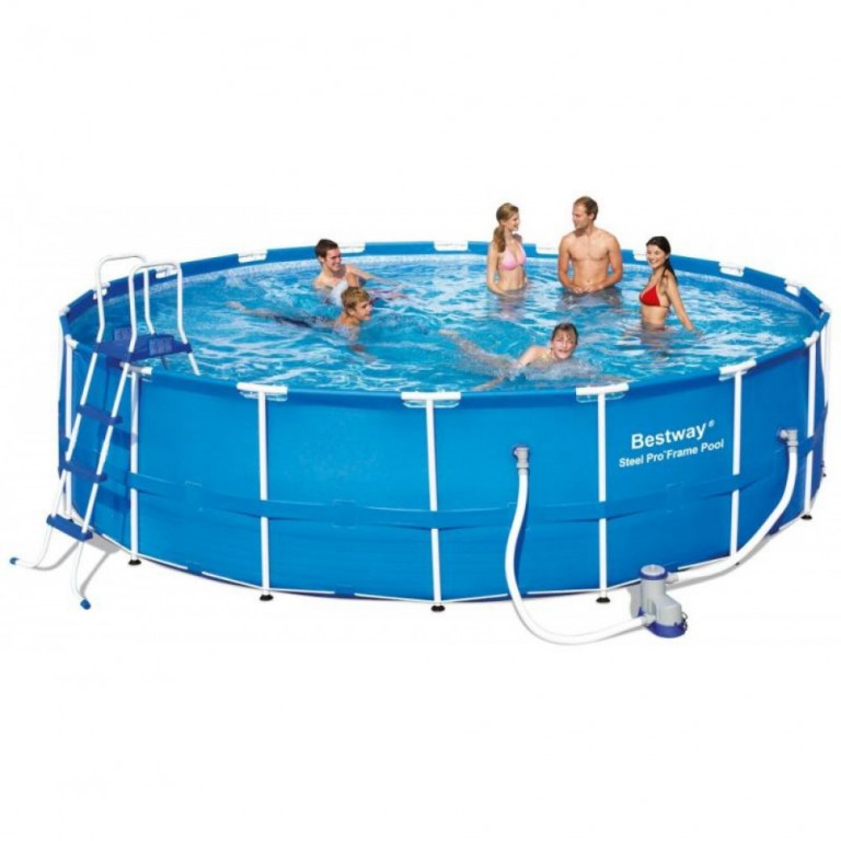 - Nadzemni porodični bazen sa konstrukcijom od metalnih šipki. Lako se montira postavljanjem na ravnu površinu.