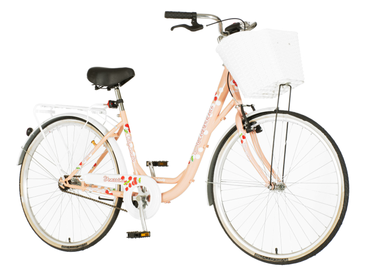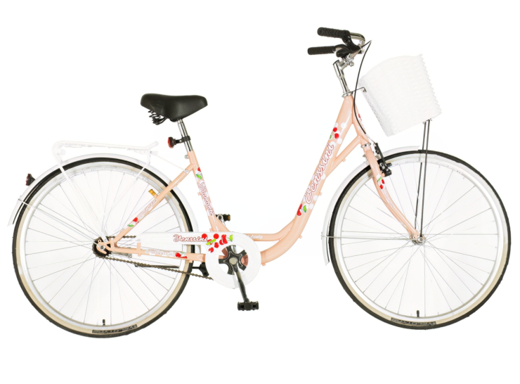 Romantični ženski bicikl za uživanje u gradskoj vožnji. Prelepa kombinacija boja ističe ovaj model u odnosu na druge, odiše prolećnim bojama i motivima. Detalji sa višnjama podižu celu priču. Sedište je udobno i komforno, poseduje pletenu korpu u beloj boji, takođe ima i zadnji paktreger. Veličina točkova od 26x1.3/8”, garantuje udobnu i laganu vožnju. Ram je čelični, zahvajujući kome je bicikla vrlo izdržljiva.