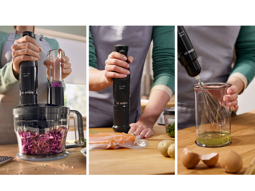 - Ugrađen dodatni pribor: 1 x Lončić za mešanje sa skalom za merenje, 1 x Noga za mešanje, nerđajući čelik, 1 x Univerzalna seckalica