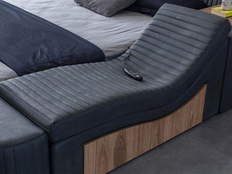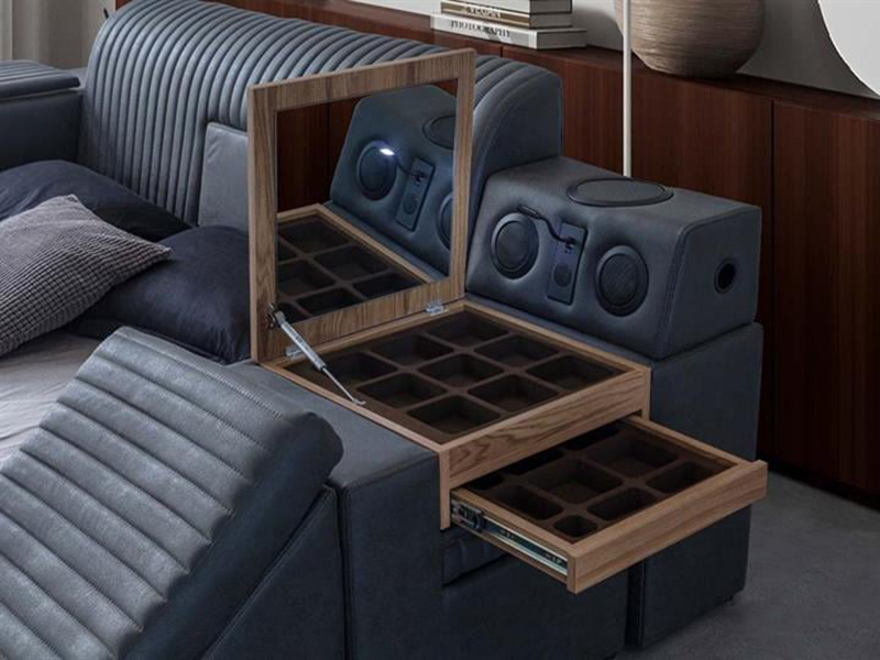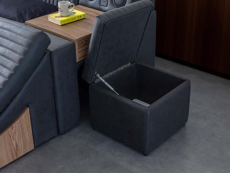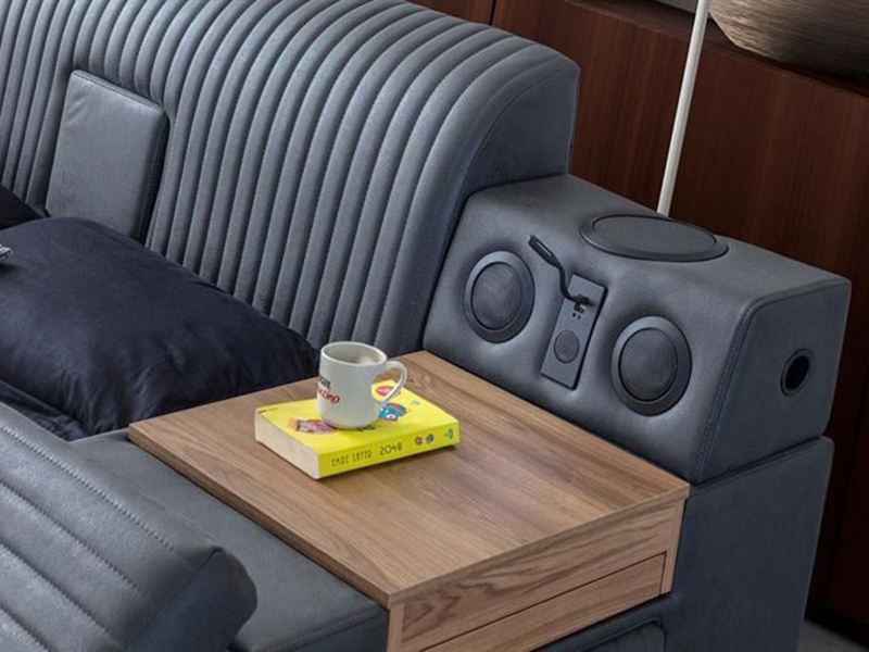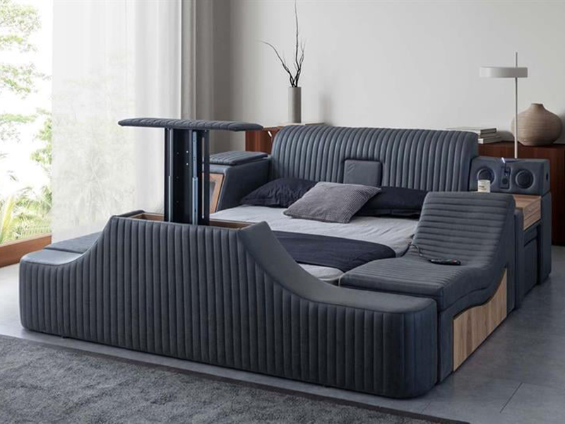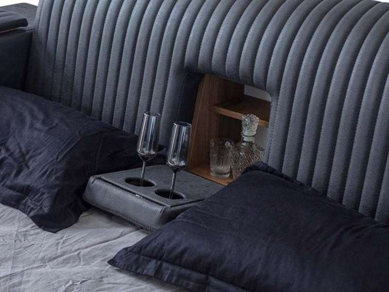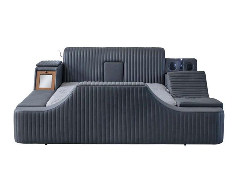Bračni Smart krevet Sunshine EY * Dimenzije : Š:250 cm D:265 cm V:100 cm U ponudi je Bračni Smart krevet Sunshine EY postupkom tapaciranja noseće konstrukcije od punog grabovog drveta sunđerom i nubuk plavo-sivom kožom. Drveni delovi su izrađeni u kombinaciji sa univerom presvučenim melaminskom folijom drvnog dezena okantovanog abs trakom. Veličina samog bračnog kreveta je 160 x 200 cm. Garnitura je izuzetno bogatog dizajna estetski i funkcionalno pripada luksuznom enterijeru. U predelu uznožja postoji konzolni nosač za televizor,lux varijanta. Krevet ima dodatke u vidu fotelje za relaksaciju,kompletan kutak sa ozvučenjem,punjačem,kafe i PC stočićem,mnoštvom polica,fioke za odlaganje,... Kutak za šminku i nakit 53 x 47 cm,relax fotelja 55 x 135 x 70 cm. Postoje i odeljci za piće,odlaganje istog što pruža doživljaj u potpunosti . Vrhunski dizajn,funkcionalnost i estetika u jednom.