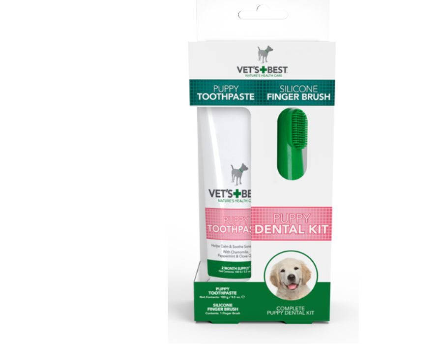 - Pasta za zube za štence prijatnog ukusa koja mamentalno ima efekat otklanjanja plaka i kamenca. Uključena je i silikonska četkica za prst koja nežno čisti oko svakog zuba i dozvoljava pristup iz svakog ugla. Nežna mešavina sastojaka formulisanih da zadovolji potrebe štenaca kojima izbijaju zubi.