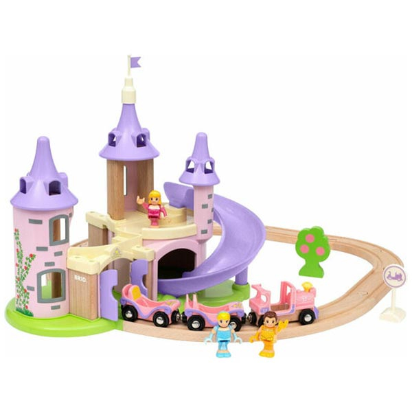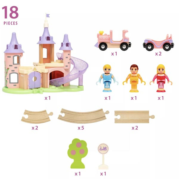 - Ovaj šarmantni set za igru uključuje veličanstveni dvorac, drvene železničke šine, princezin voz sa vagonima, tri lika Diznijevih princeza i dodatke.
