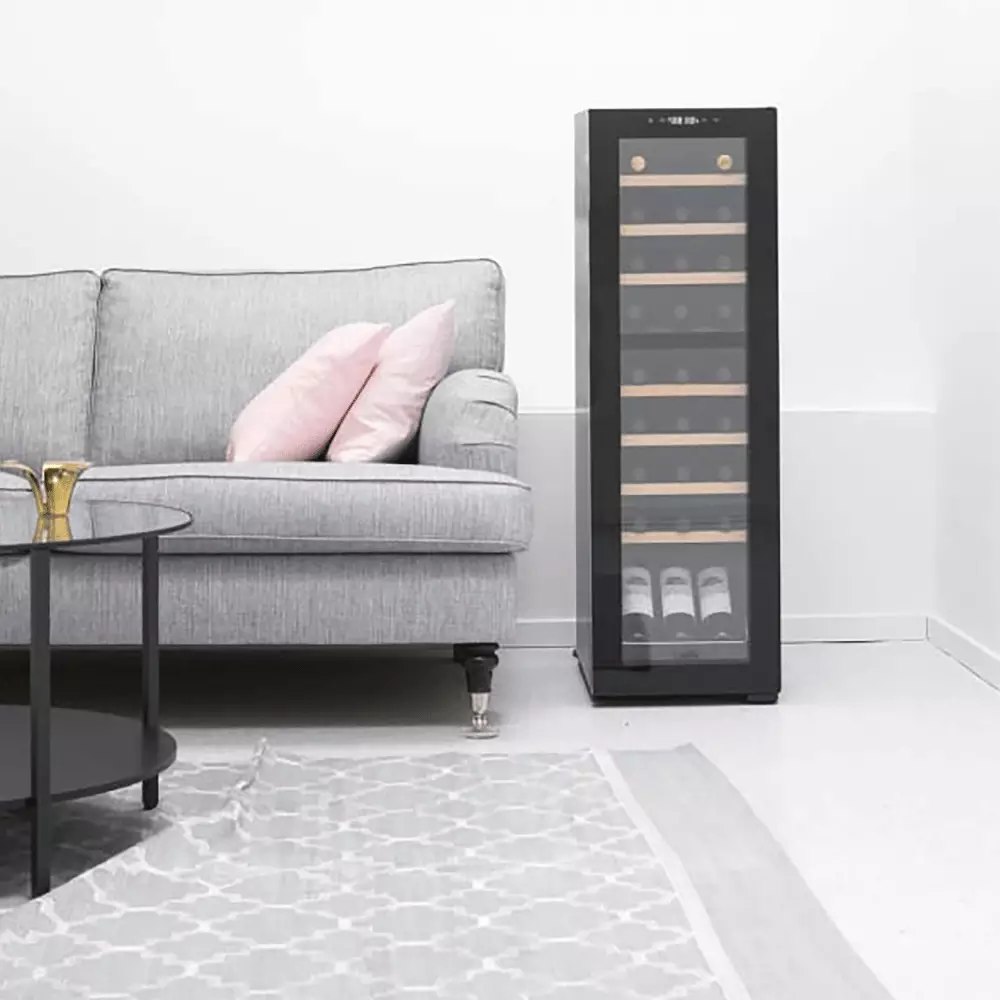 Samostojeća vinska vitrina CAVIN NC-27B predstavlja elegantno rešenje za ljubitelje vina koji žele pouzdan frižider za male do srednje velike kolekcije. Sa dve temperaturne zone (gornja 5–18 °C, donja 5–18 °C), omogućava odvojeno skladištenje crvenih i belih vina u idealnim uslovima. Vitrina nudi prostor za do 27 boca (0,75 l Bordo) i opremljena je elegantnim crnim staklenim vratima sa UV zaštitom i belim LED osvetljenjem, što obezbeđuje jasnost i sofisticiran izgled. Pouzdan sistem hlađenja sa kompresorom obezbeđuje stabilnu temperaturu, tihi rad i dugoročnu sigurnost vaše kolekcije vina.2. Zašto odabrati ovaj model
