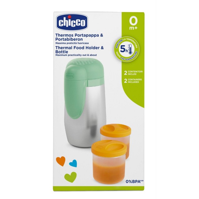 - Chicco držač flašica i hrane za bebe napravljen od nerđajućeg čelika, omogućava Vam da flašicu iz kolekcije Chicco NaturalFeeling i hranu za bebe ponesete van kuće sa sobom, održavajući temeperaturu sadržaja od 2 do 5 časova. Termos za flašice I hranu garantuje maksimalnu udobnost kada dete treba da nahranite van kuće zahvaljujući dvema praktičnim posudama zapremine od 250ml (za kačice I supice). Kao dodatak tu je I jedan praktični džep za držanje dečjeg escajga sa poklopcem koji može da posluži kao tanjirić. Kada dete prestane da sisa može da se koristi kao normalan termos za nošenje čvrste hrane, hladne ili tople, kao I za sveže napitke za celu porodicu.