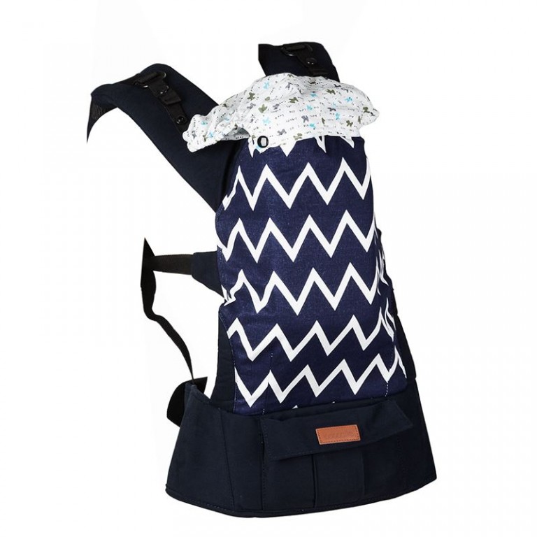 - Nosač je opremljen kapuljačom koja se skida za zaštitu bebe tokom šetnje i prednjim džepom