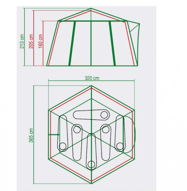 - Posebno oblikovani višestrani šator pruža potpuni pogled od 360° na vašu okolinu i ima genijalna kruta vrata na šarkama koja mu daju ugođaj u kampu. Četiri od šest strana se potpuno otvaraju, omogućavajući puno svetlosti i vazduha u šator. Šator ima dva otvora za vrata od kojih se jedan pogodno otvara kao obična vrata. Čelični stubovi označeni bojom čine bacanje pravo napred i brzo za manje od 15 minuta. Ovaj jednosobni šator ima mnoštvo namena, može biti obučen kao luksuzna glamping spavaća soba, igraonica za decu ili savršen šator za festivalska okupljanja. Prevlaka se takođe može ukloniti pretvarajući je u prostoriju zaštićenu od buba, savršenu za baštu.