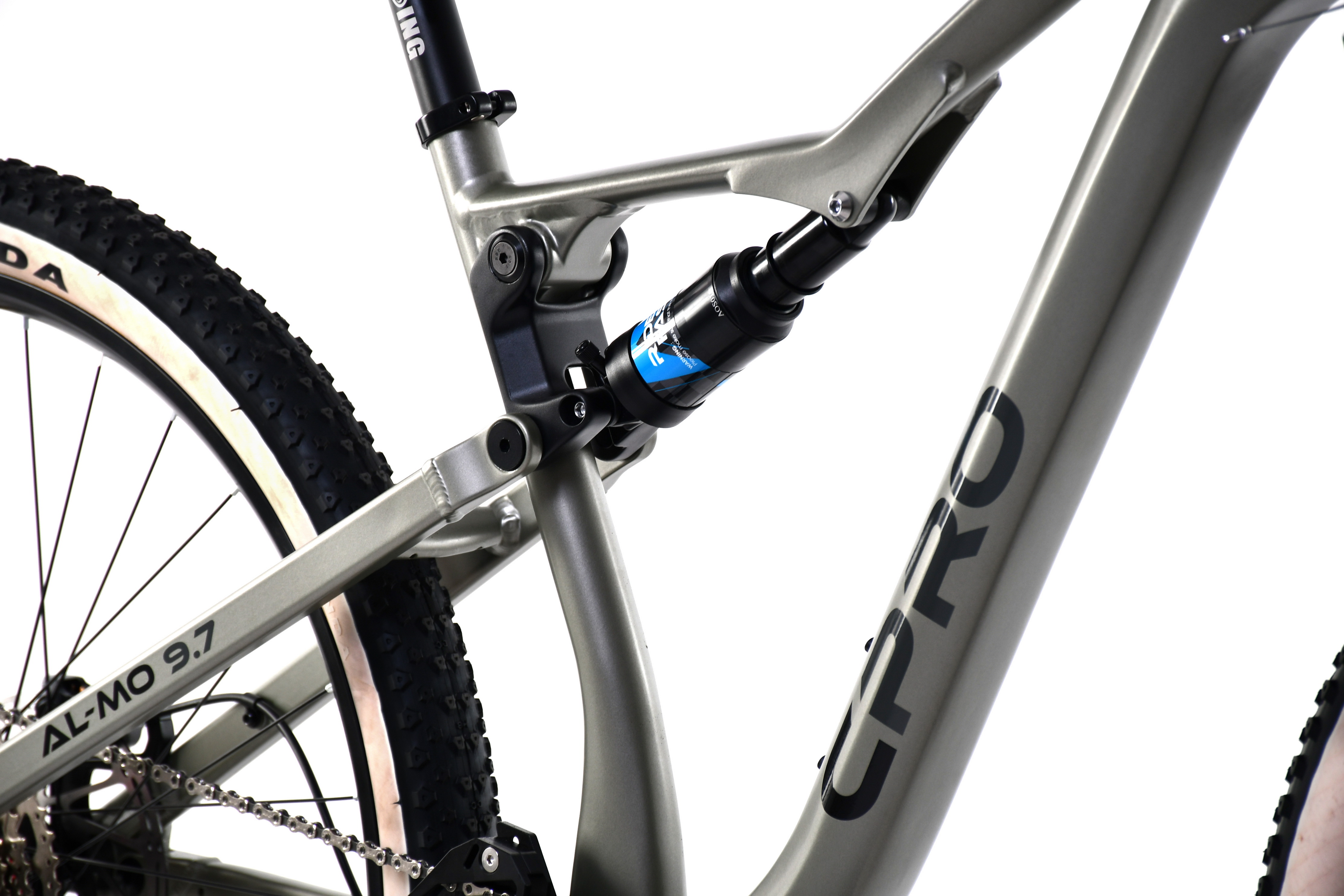 CPRO AL-MO 9.7 izuzetno zanimljiv full suspension bicikl sa Race geometrijom, ima ram od aluminijuma legure 6061 koji je dizajniran za savladavanje zahtevnijih brdskih puteva i staza. Izdvaja se po izuzetno kvalitetnim amortizerima koji su i prednji i zadnji - AIR amortizeri, unutrašnje vođenje kabla, 1x12 set menjača gde su ručica menjača i zadnji menjač DEORE. Takođe model izdvaja jači dvocilindrični set kočnica,prednja i zadnja glava sa industrijskim ležajem. Treba naglasiti da sadrži THRU AXLE brz zatvarač glave i da se stub sedišta može podešavati. Preporučena visina vozača je 175-185cm.