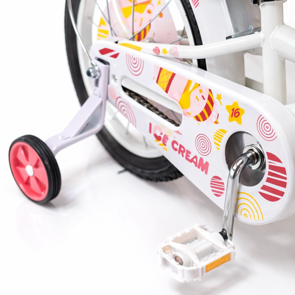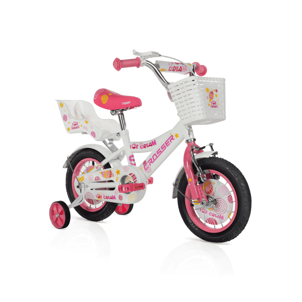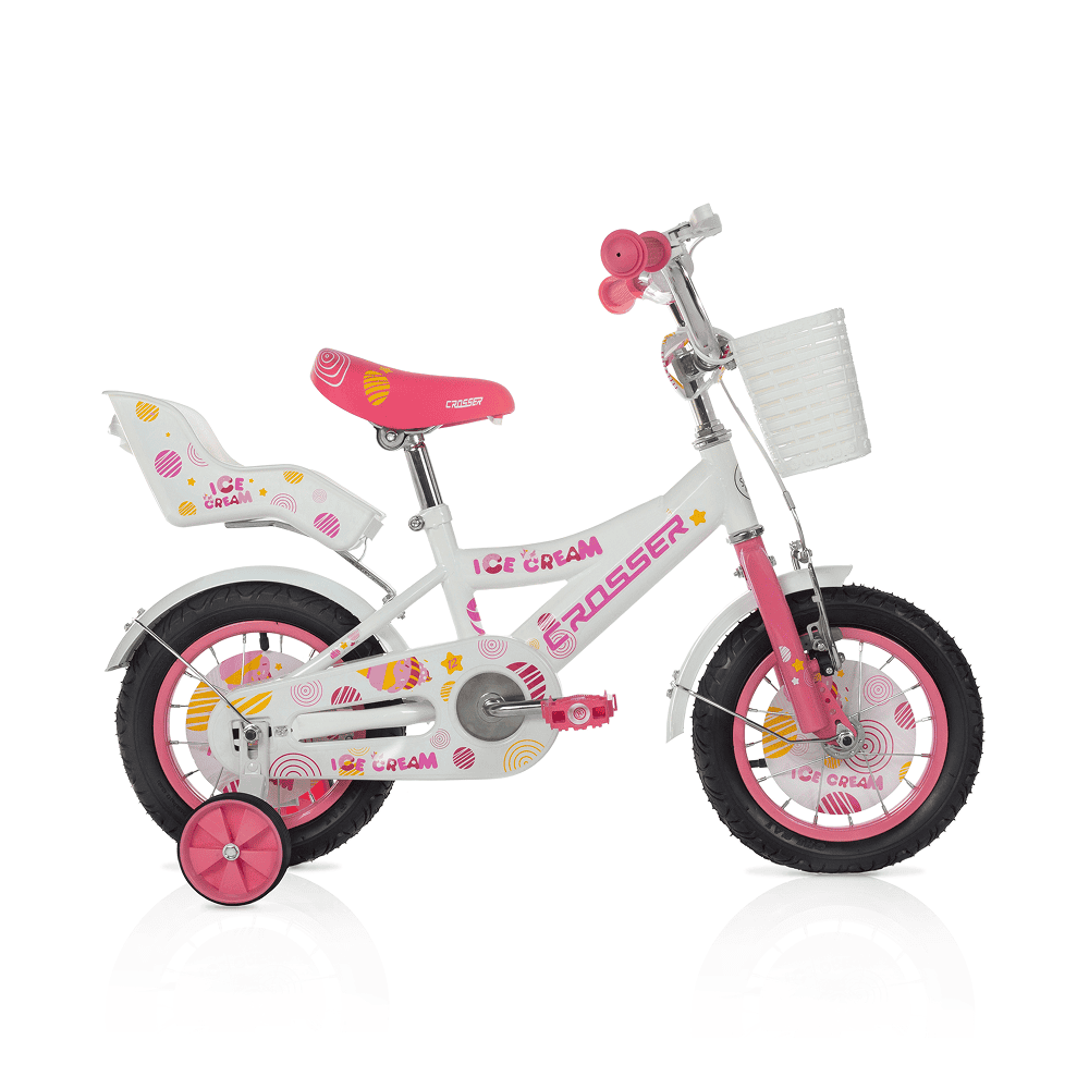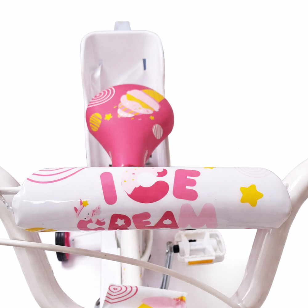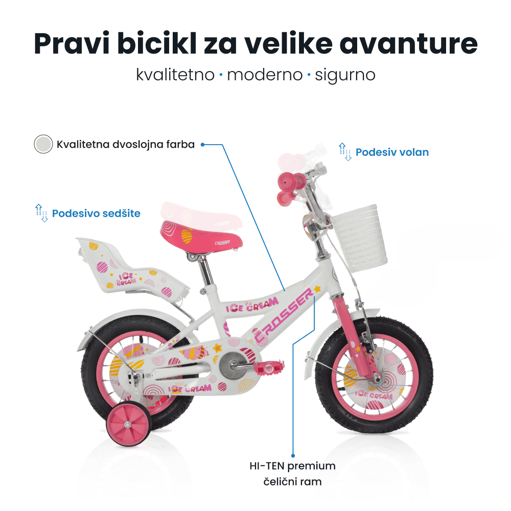 Pravi bicikl za velike avanture! Ovaj bicikl sa šarenim motivima sladoleda je savršen za devojčice uzrasta od 2 do 4 godine. Nizak ram omogućava lako penjanje i silazak.Moderni dizajn bicikla ne samo da čini svaku vožnju zabavnom, već i sigurnom, a to je ono što je najvažnije! Moderni dizajn i dugotrajan kvalitet Bicikl se izdvaja zahvaljujući HI-TEN premium čeličnom ramenu koji garantuje izuzetnu čvrstoću, a dvoslojna farba u modernim bojama štiti bicikl od spoljnih uticaja, čineći ga dugotrajnim i uvek atraktivnim. Funkcionalnost za mališane Pomoćni točkići pružaju stabilnost dok mališani savladaju prve vožnje, a prednja korpa je idealna za omiljene igračke. Zadnja korpa može da posluži za sve sitnice koje mali vozači žele da ponesu sa sobom na svojim avanturama. Lako do prve vožnje Bicikl stiže već 85% montiran . Bicikl se isporučuje u originalnoj kutiji.Uz osnovni alat – ključ i šrafciger – bicikl je brzo spreman za prvu vožnju. KARAKTERISTIKE PROIZVODA Materijal rama: Hi-ten premium čelik Sedište: Udobno sedište od pene Srednji pogon: Čelik, 32TX152MM Brzina: 1 Kočnica: Čeljusna - Prednja, Zadnja- Kontra kočnica Glave: Čelik Dimenzije točka: 12"(inča) Težina kg / weight kg: 11 Kg Blatobrani: Metalni Lancobran: Plastični