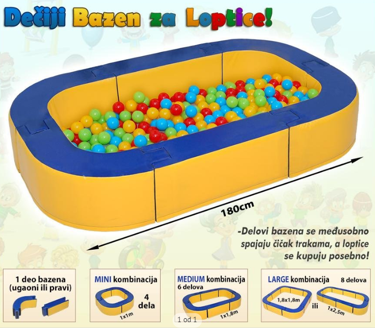 - Ovaj dečiji bazen za loptice i igranje se spaja kombinovanjem ugaonih i pravih delova koji se mogu kupovati pojedinačno ili kao kombinacije od 4 , 6 , 8 ili više delova koji se međusobno spajaju čičak trakama. Ovaj bazen za decu ili bazen za igraonicu ili igraonice može da bude visine 30cm ili 50cm a dužina i širina zavisi od načina postavljanja njegovih delova.