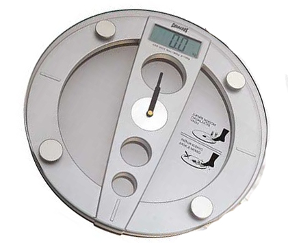 Digitalna telesna vaga za merenje, sa staklenom površinom, elegantnog dizajna. Meri do 180kg težine. Osim težine ova vaga prikazuje i vreme - ima sat sa kazaljkama.