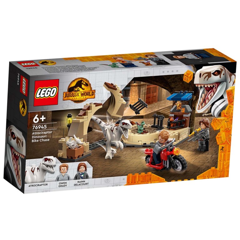 Ljubitelji mogu da ožive uzbuđenje filma „Svet iz doba jure: Nadmoć“ uz komplet za gradnju Dinosaurus atrociraptor: Jurnjava na motoru (76945). Idealan je poklon za decu uzrasta 6+ koja zaslužuju nagradu – ovaj komplet sadrži podesivu figuru igračku atrociraptora, motocikl i pijacu od kocki sa sklopivim zidom koji se jednostavno transformiše i rotirajućim terenom za borbu dinosaurusa. Akciono igranje uloga Ovaj lako prenosivi komplet uključuje mini-figure Ovena Grejdija i Reina Delakora sa pištoljem za uspavljivanje, kao i 2 male figure igračke dinosaurusa za zabavno, kreativno igranje uloga. Tu su i postupna uputstva, tako da čak i početnici mogu da uživaju u procesu gradnje, a komplet se savršeno kombinuje sa kompletom Bekstvo dinosaurusa T-reksa i atrociraptora (76948) za još veću akciju. Zabava sa dinosaurusima! Kompleti LEGO® Jurassic World sadrže livene figure dinosaurusa koje se grade, mini-figure i detaljna vozila za rekonstrukciju scena iz filmova i animiranih serija, za igru sa novim pričama ili jednostavno za gradnju i izlaganje kolekcionarskih modela.