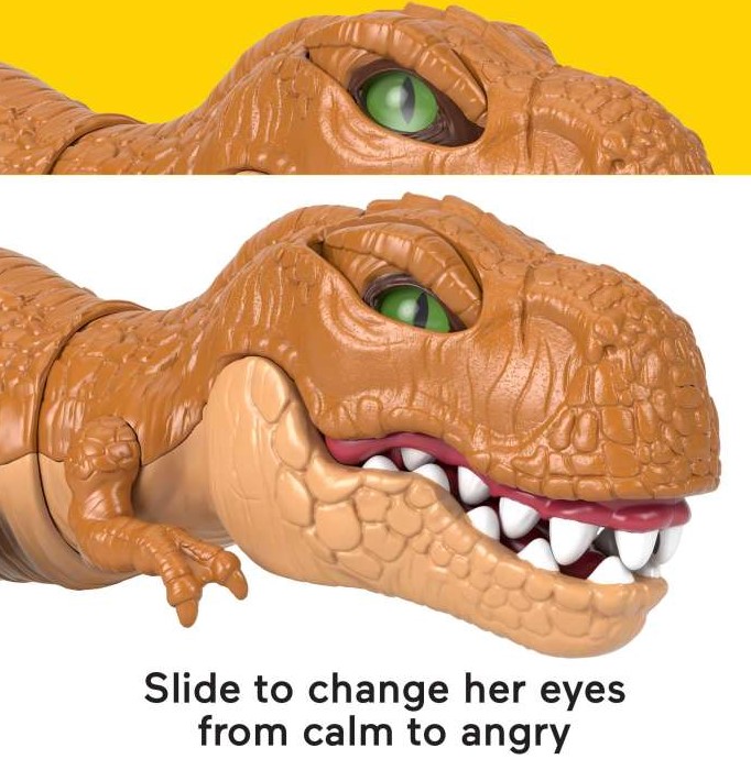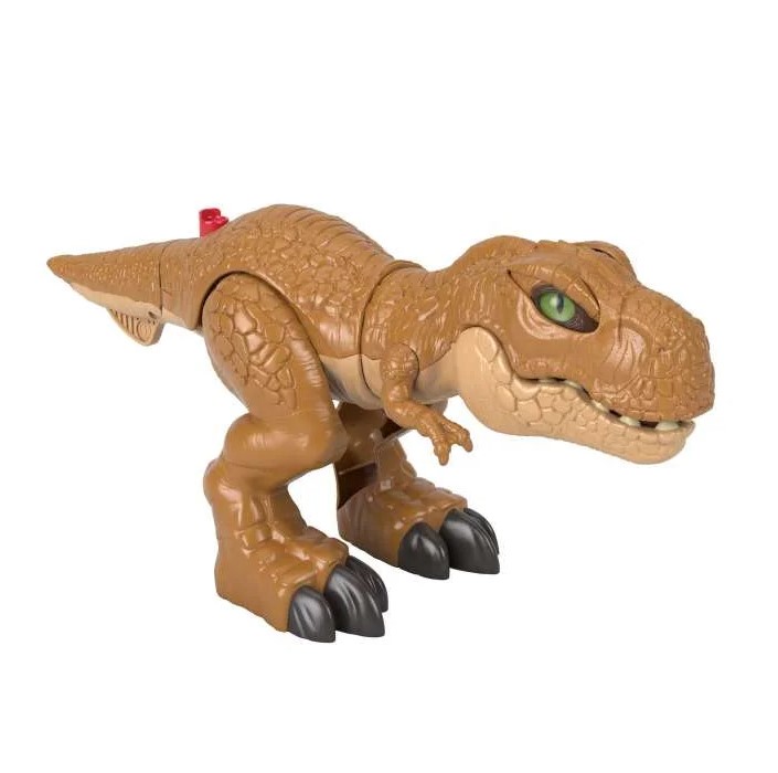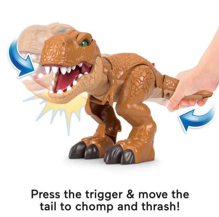 - Pritiskom crvenog dugmića, dinosaurus izbacuje čeljust, a pritiskom okidača s donje strane repa, pokreće se ugriz.