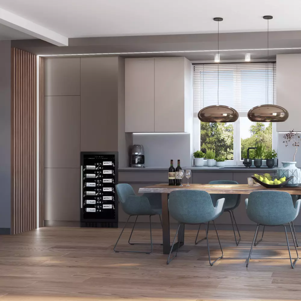 Vitrinu je moguće postaviti samostojeću ili ugraditi u kuhinjske elemente, jer je u pitanju takozvana ugradno–samostojeća vinska vitrina. Posebnost ovog modela je pažljivo dizajniran sistem hlađenja koji ne zahteva dodatni prostor oko uređaja. Ventilacija je obezbeđena na dnu vitrine, ispod vrata – u coklu, što omogućava potpunu i bezbednu integraciju u nameštaj.