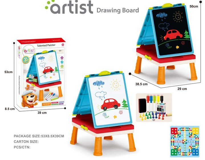 Sadrži dve table za pisanje, sa kredama i flomasterima, table sa društvenim igrama